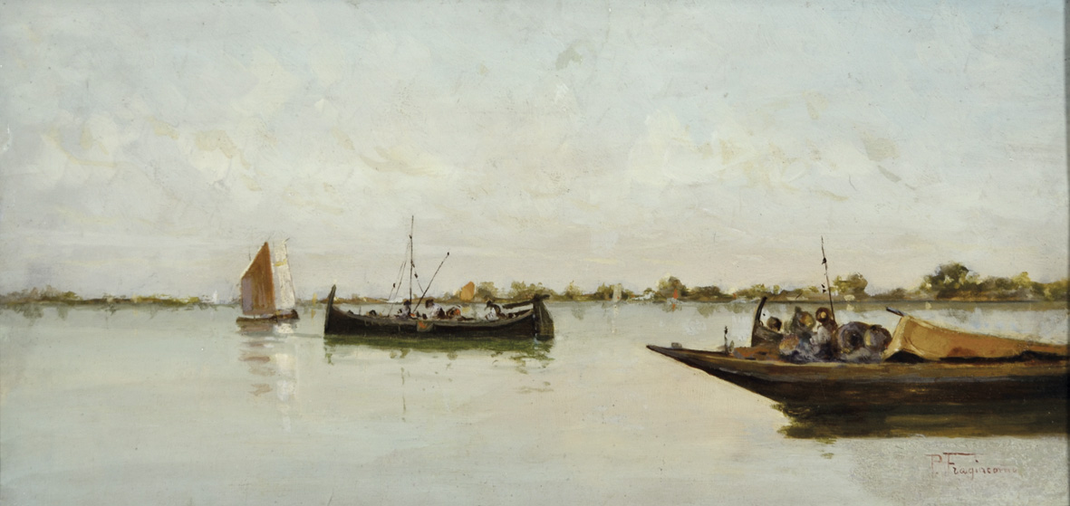FRAGIACOMO PIETRO Trieste 1856 - Venezia 1922 Barche in laguna (1990) olio su tavola 21x42 firma in basso a destra autentica del prof. Giovanni Granzotto su foto