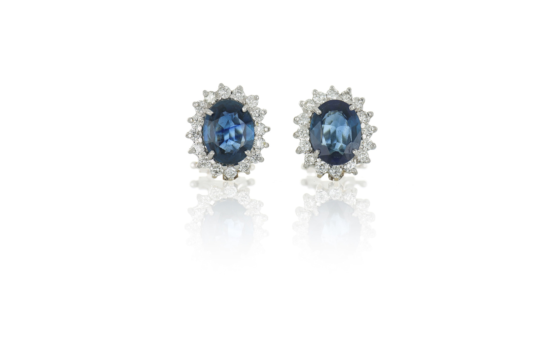 Orecchini in oro bianco a margherita due zaffiri taglio ovale per complessivi ct. 4 0 ca. sono contornati da piccoli diamanti taglio brillante per complessivi ct. 0 70 ca.