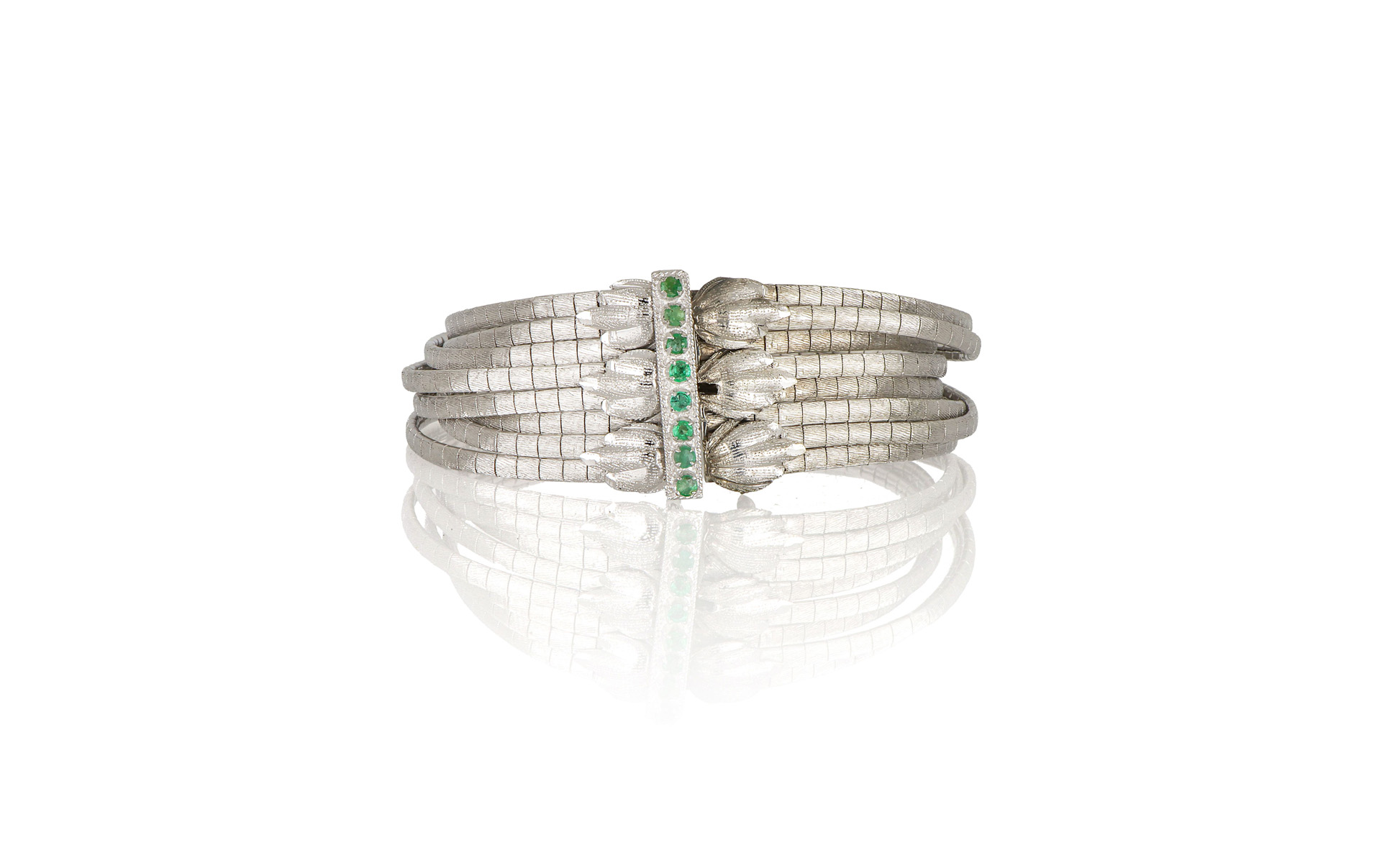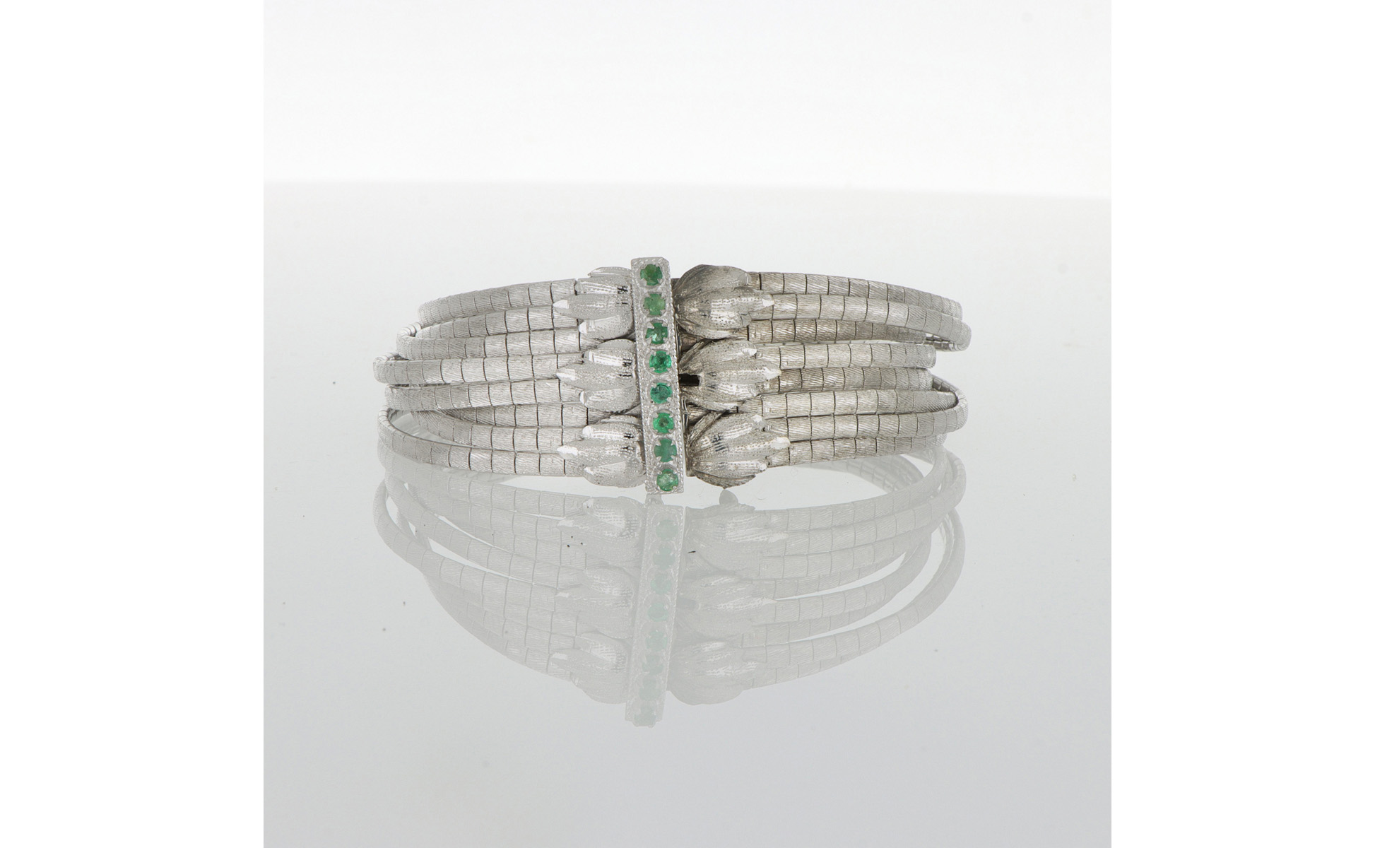 Bracciale in oro bianco a 8 fili morbidi e satinati piccoli smeraldi nella chiusura a barretta.