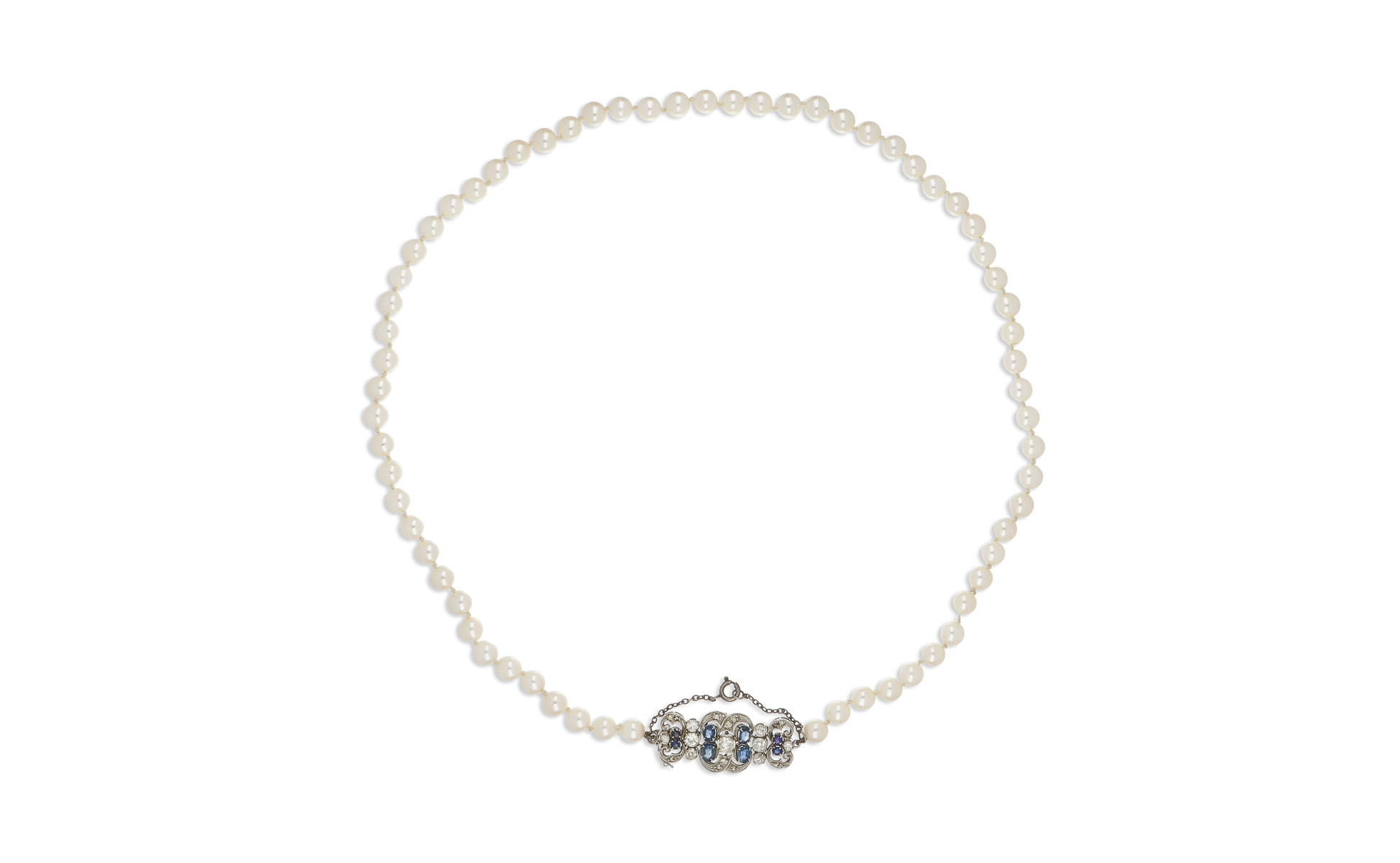 Collana di perle coltivate di acqua salata di 7/7 5 mm di diametro con bella chiusura in oro bianco con diamanti e zaffiri.