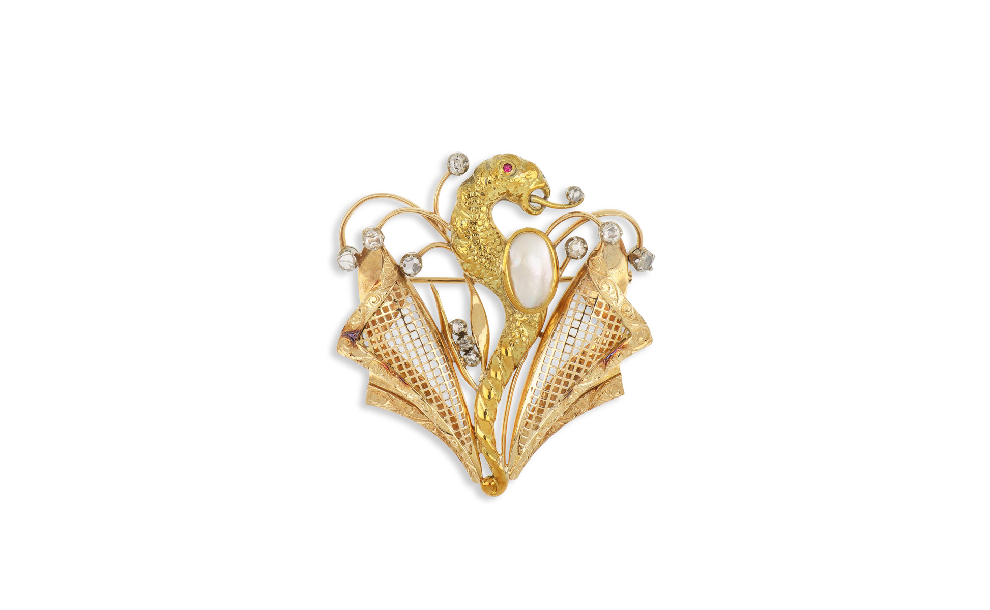Grande spilla in oro giallo anni '50 il disegno fantastico include un draghetto che morde uno stelo piccoli diamanti e rubini a decoro.