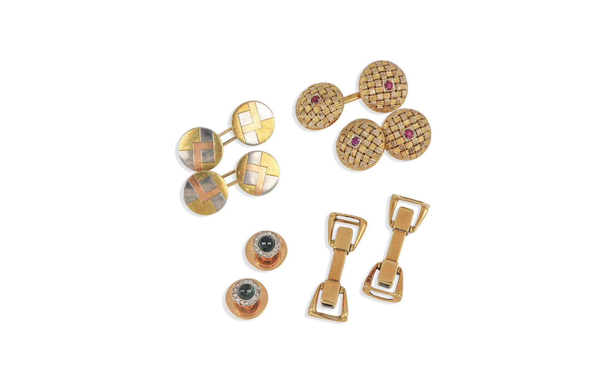 Lotto composto da 4 paia di gemelli in oro giallo e bianco piccoli rubini zaffiri cabochon e carrè.