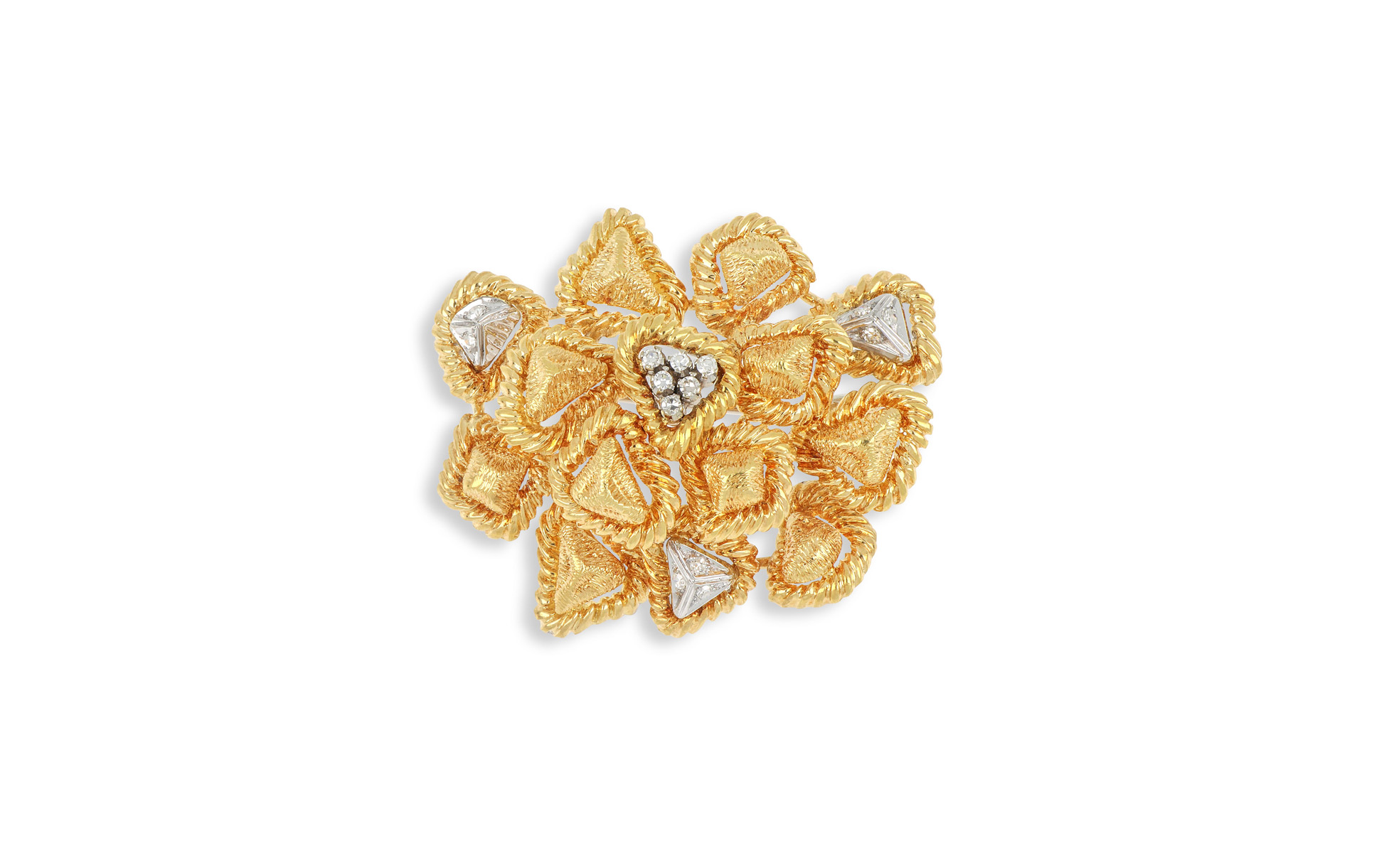 Spilla fantasia in oro giallo e bianco con piccoli diamanti taglio brillante al centro.