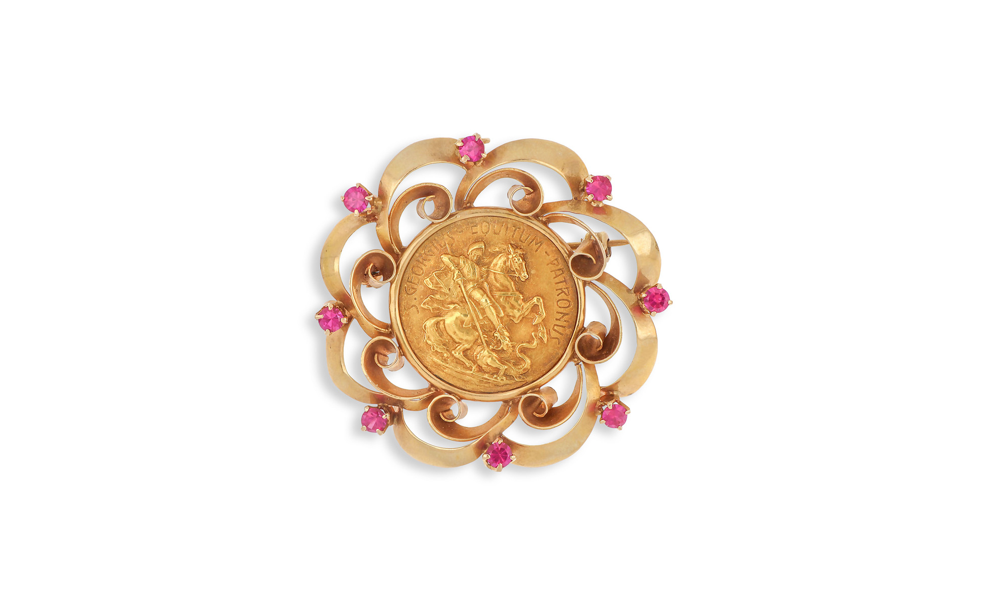 Spilla in oro giallo a volute con medaglia raffigurante San Giorgio.