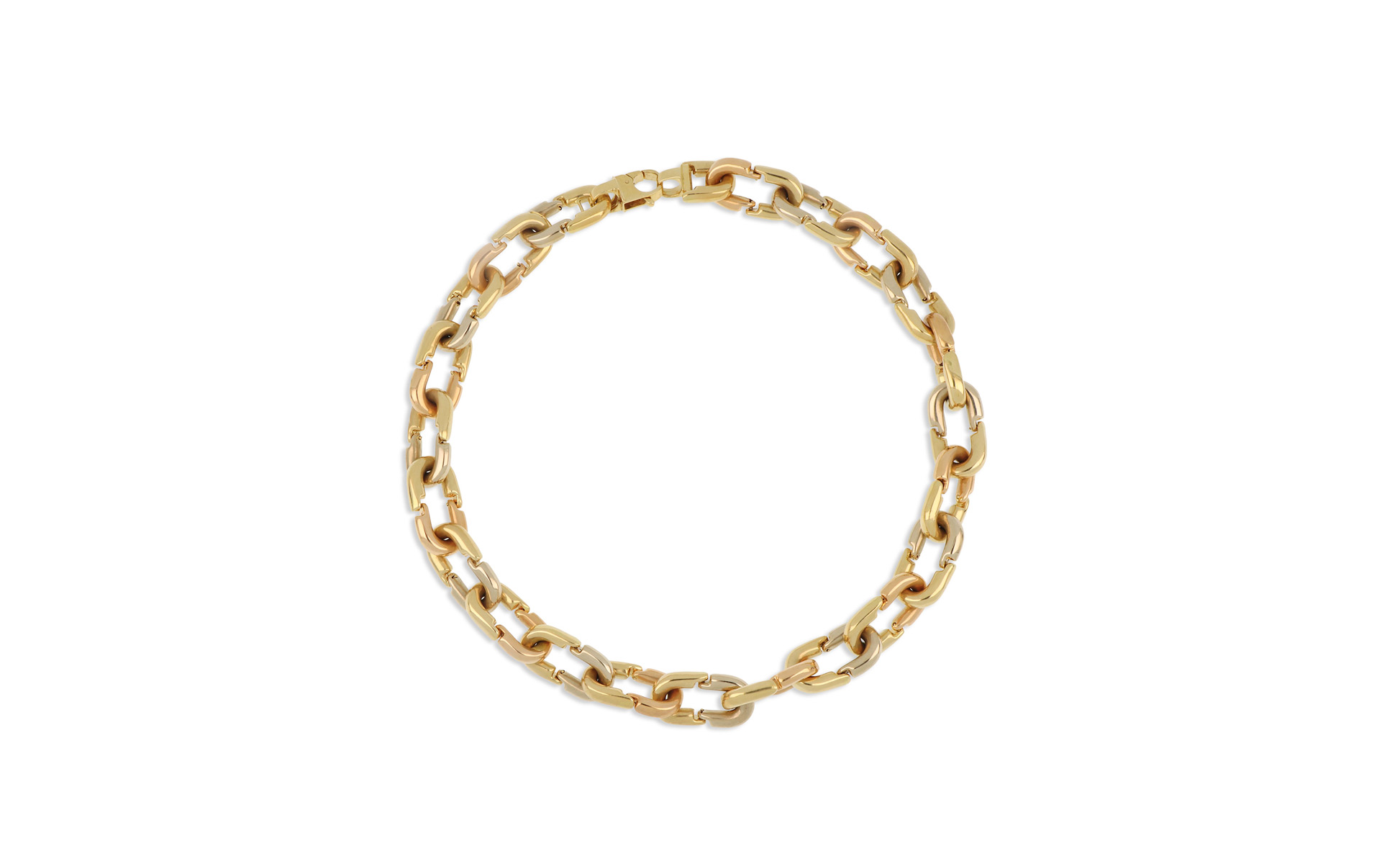 Girocollo in oro giallo bianco e rosso grandi maglie snodate al centro si alternano nei 3 colori dell'oro.