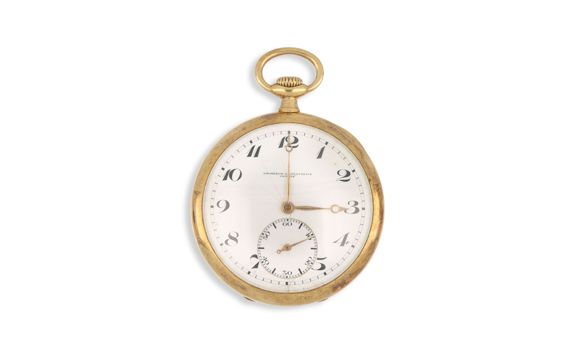 VACHERON E CONSTANTIN orologio da tasca doppia cassa in oro giallo mancante della contro cassa al meccanismo movimento meccanico con carica manuale quadrante in smalto bianco e numeri arabi.