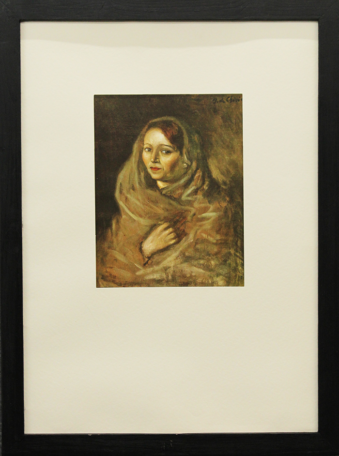 GIORGIO DE CHIRICO, "Donna Velata", ripreso dal dipinto del 1945, stampa dell'opera originale di Giorgio De Chirico del 1935 , tavola 16, dim 40x55 cm. Al verso: dettagli del quadro originale. Opera con cornice.
