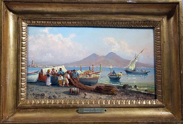 Giusti Guglielmo (Napoli 1824 - dopo il 1916) Marina con Golfo di Napoli tempera su carta, cm 18x29,5 firmato in basso a sinistra: G. Giusti Provenienza: Gall. Giosi, Napoli; coll. privata, Napoli Esposizioni: Napoli 1984 Bibliografia: Cat. Asta Giosi Napoli gennaio 1984, num cat 66, ill. 65