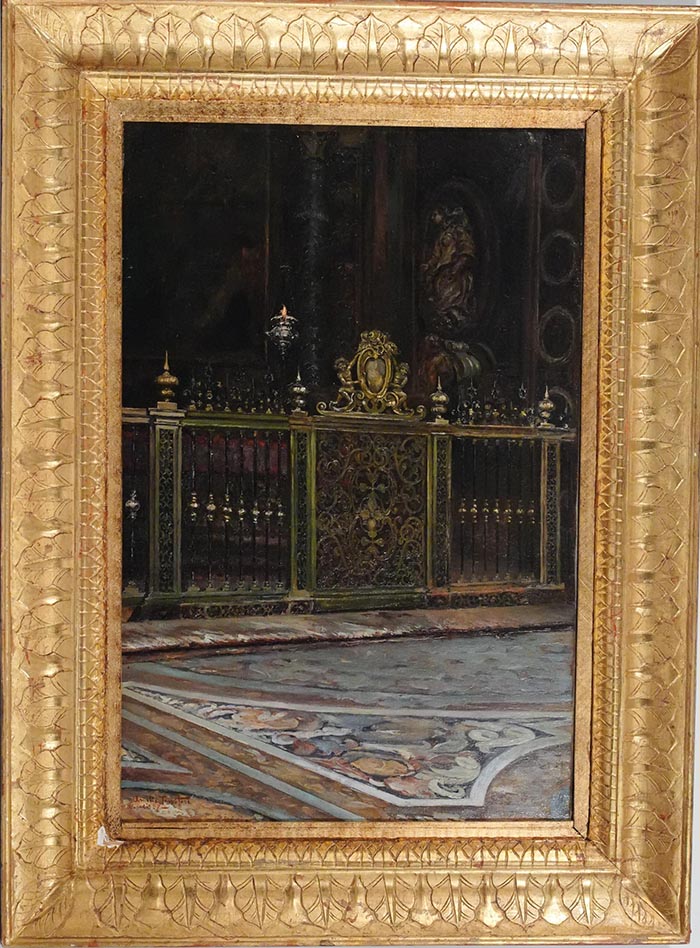 Tessitore Gelanzè Amelia (Messina 1866 - Napoli dopo 1930) La Cappella del Rosario nella basilica di San Lorenzo Maggiore Napoli olio su tela, cm 58x38 firmato, datato e iscritto in basso a sinistra: Amelia Tessitore 27