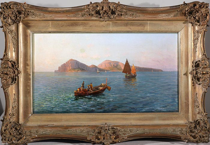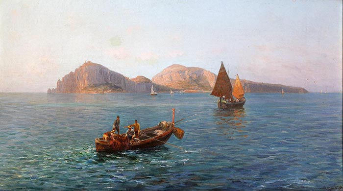 Bernard Hay (Firenze 1864 - dopo il 1916) Pescatori a Capri olio su tela, cm 32x57 firmato e iscritto in basso a destra: Bernard Hay Capri