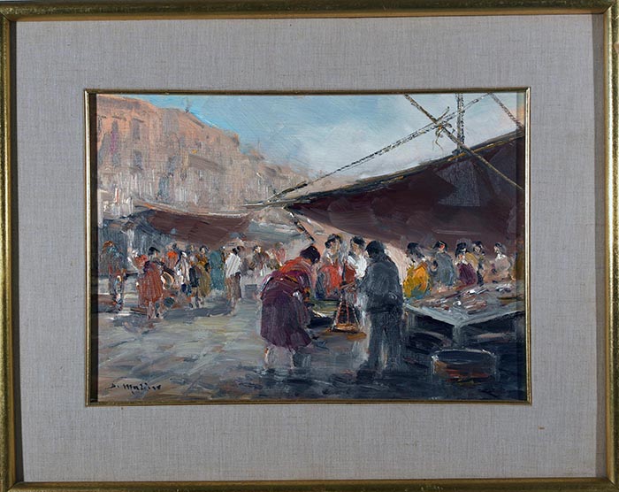 Di Marino Francesco (Napoli 1892 - 1954) Mercato olio su tavola, cm 24,5x34,5 firmato in basso a sinistra: Di Marino