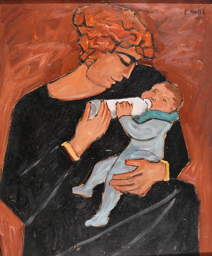 Notte Emilio attrib.(Ceglie Messapica, BR 1891 - Napoli 1982) Maternità olio su tavola, cm 60x50 firmato e datato in alto a destra: E. Notte 1963