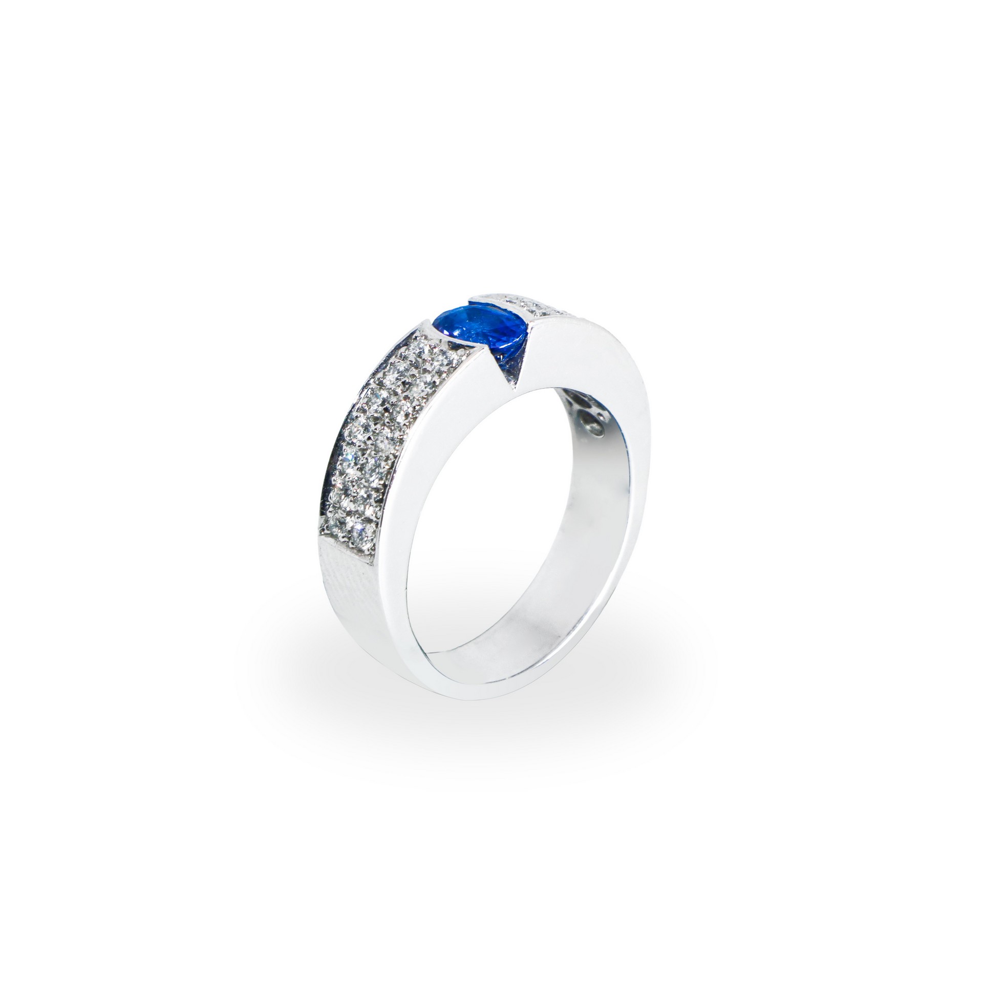 Anello in oro bianco 18 kt con diamanti taglio brillante e zaffiro silon centrale