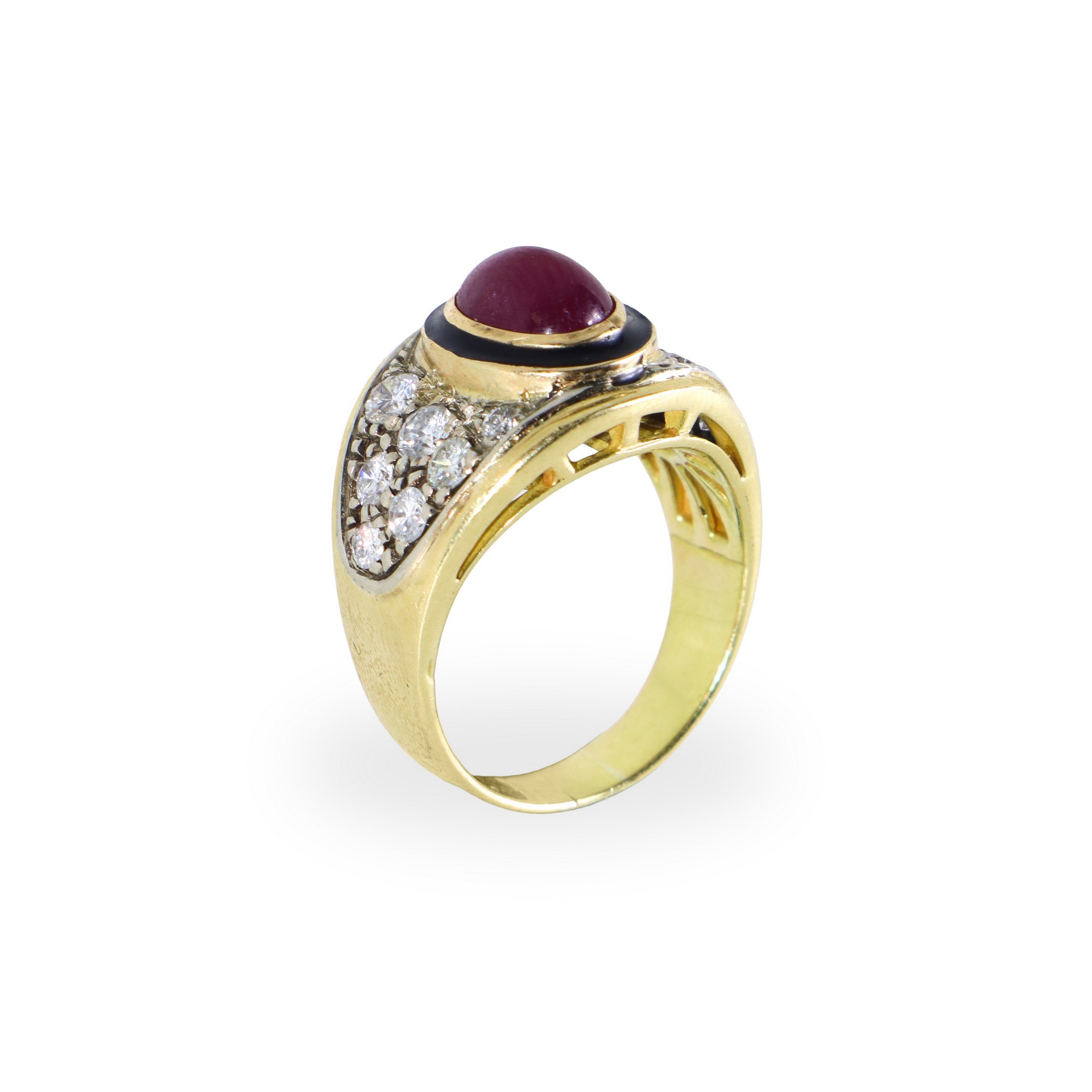 Anello a fascia in oro giallo 750 con pavè di brillanti e rubino centrale mis. 18 gr, (comprensivi di pietre) 11,2 kt brillanti 1,40 ca kt rubino 0,80 ca