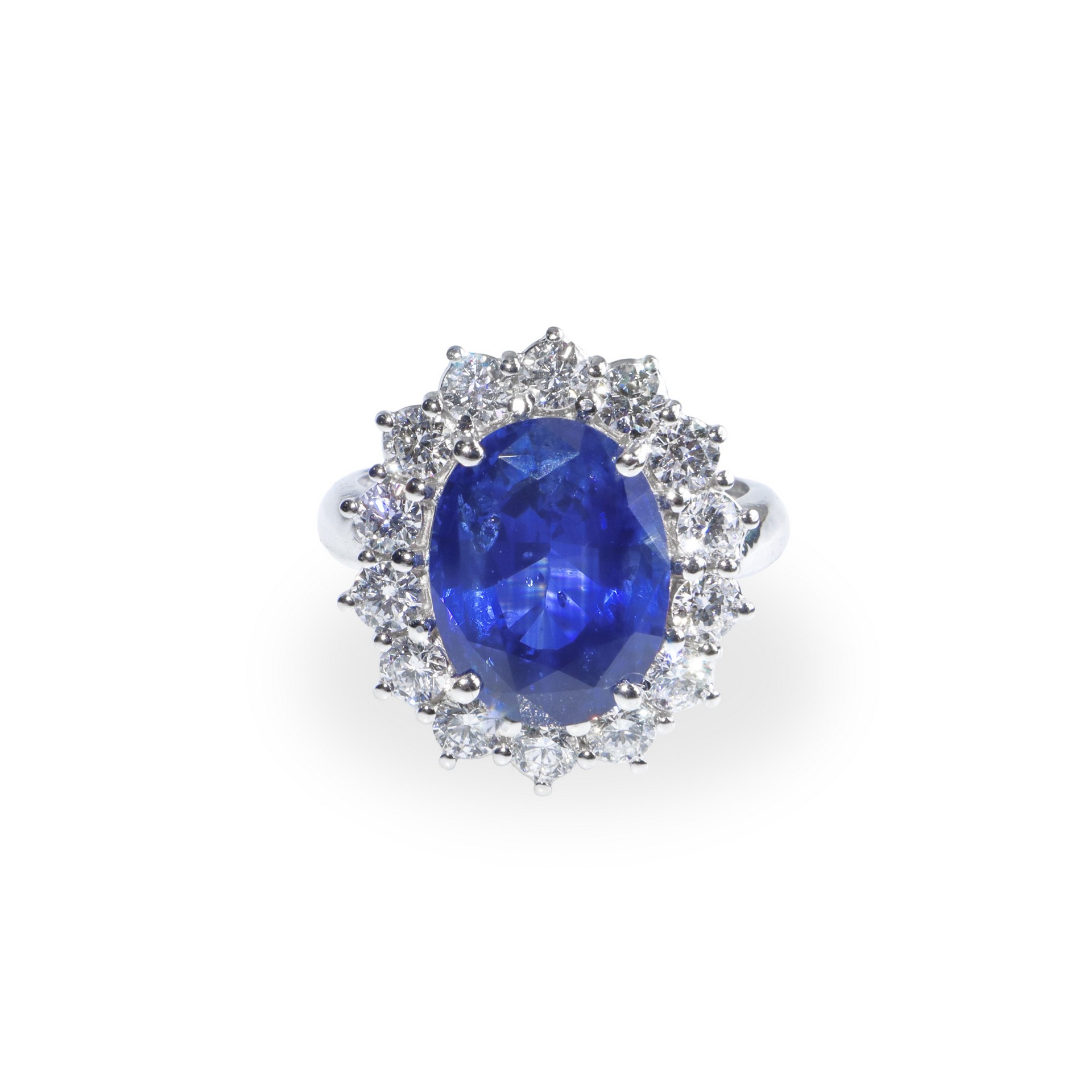 Anello in oro bianco 18 kt con zaffiro naturale Royal Blue (provenienza Sri Lanka) con contorno di brillanti kt zaffiro 6,14 gr. (complessivi) 8,7 mis. 14 kt brillanti 1,50 Trattamento zaffiro: riscaldamento