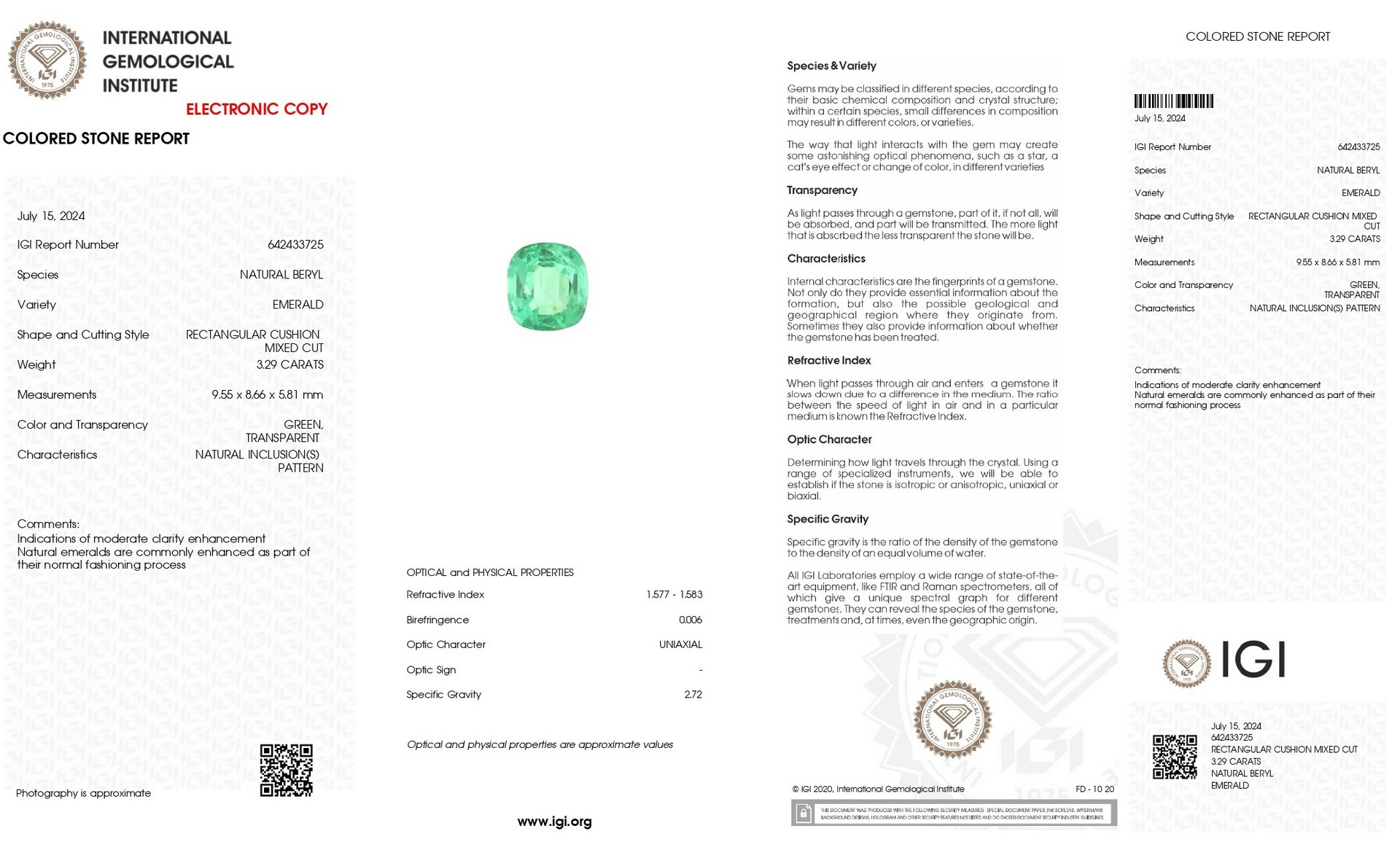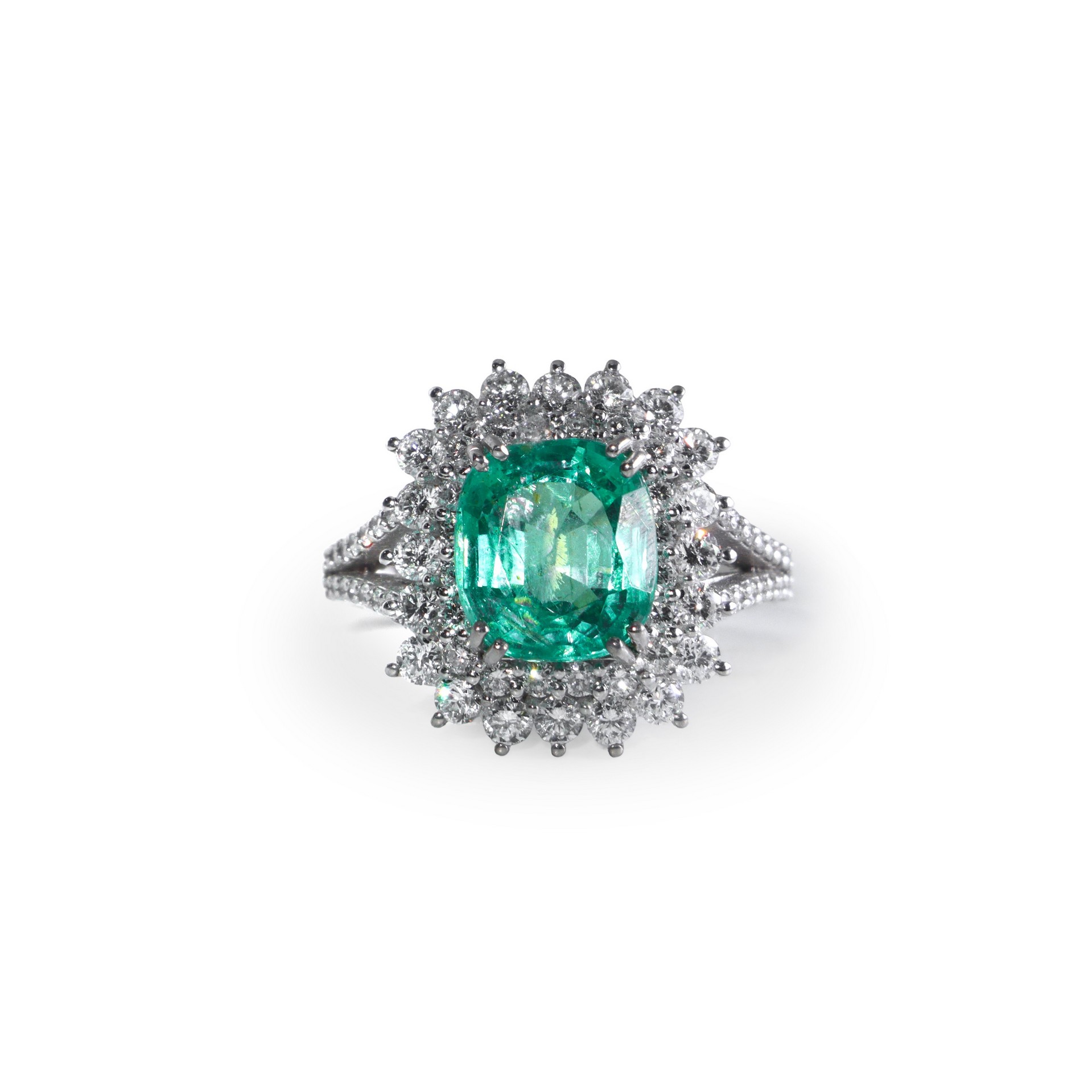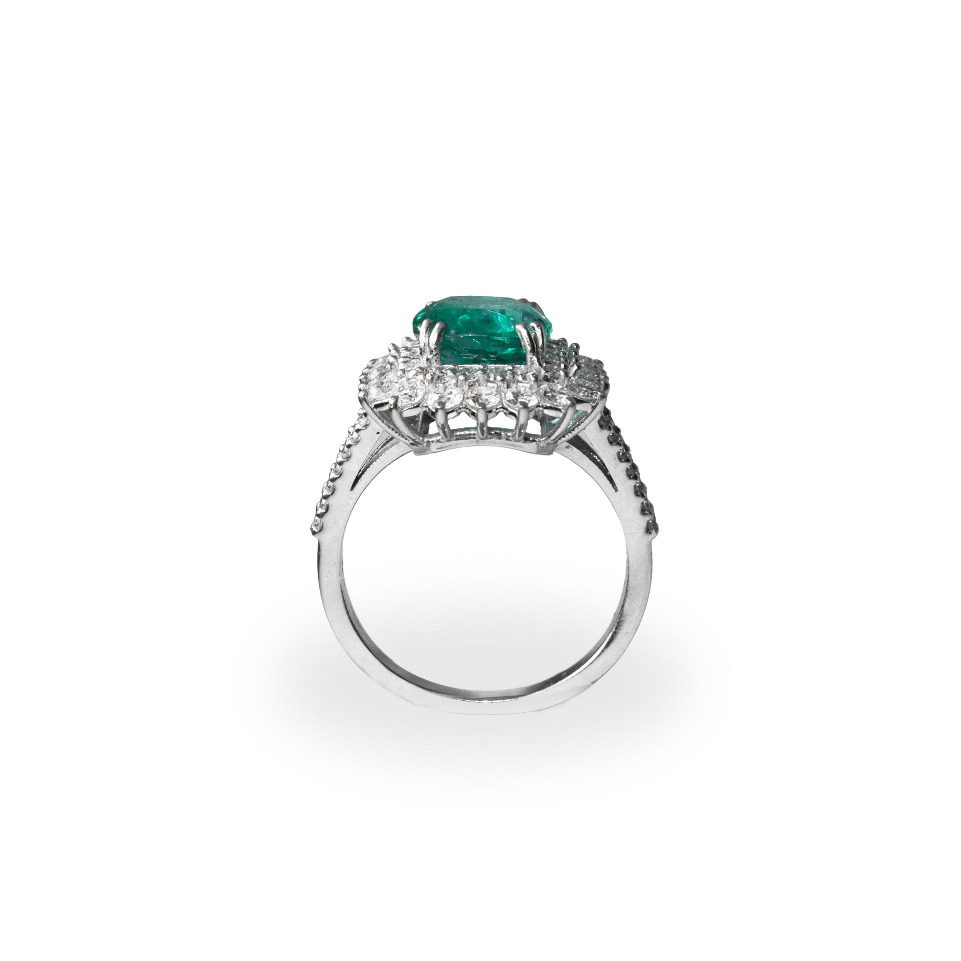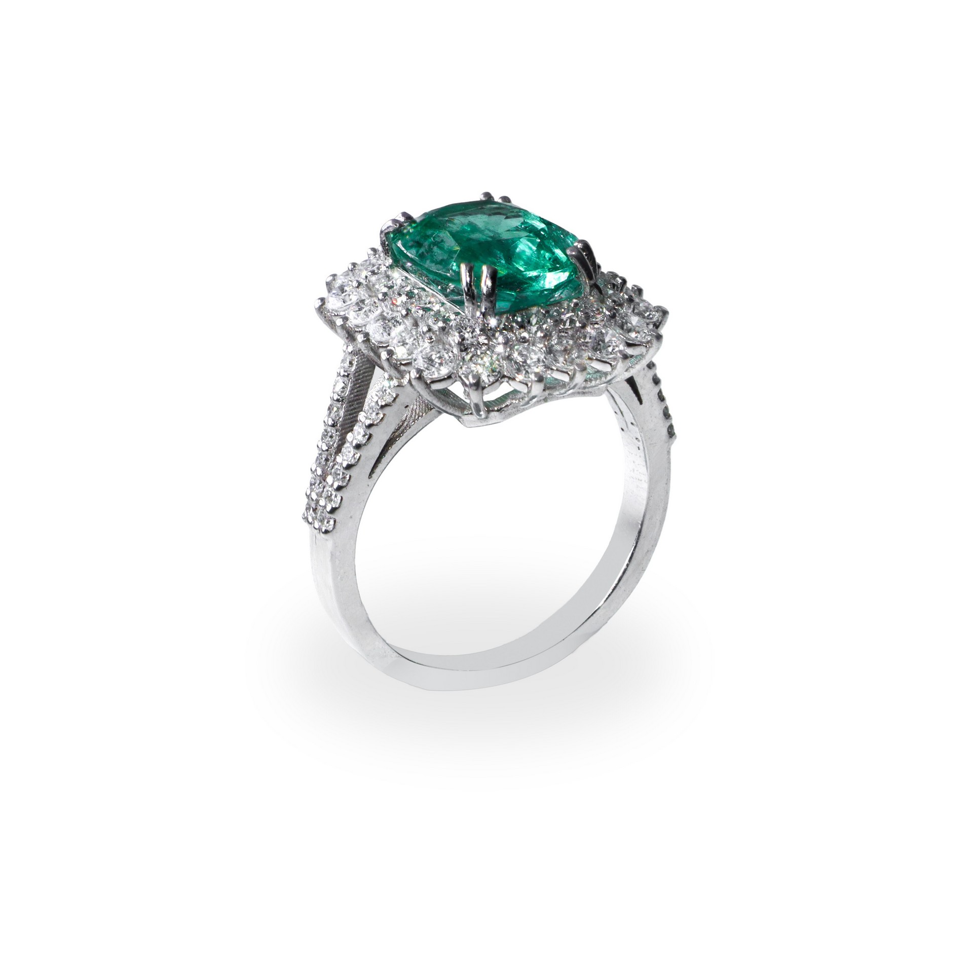 Anello in oro bianco 18 kt con smeraldo naturale (provenienza Zambia) con contorno di brillanti mis.15 smeraldo kt 3,29 Brillanti kt 1,10 gr. (complessivi) 6,2 Indicazioni di trattamento smeraldo: olio moderato