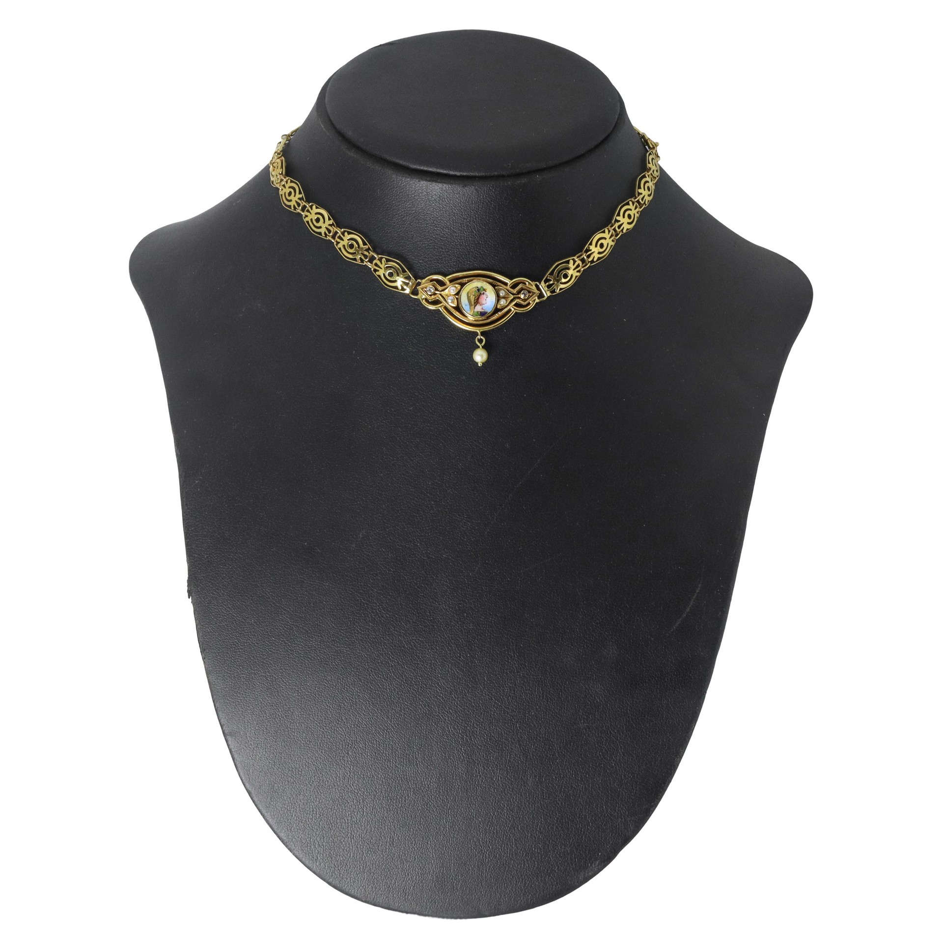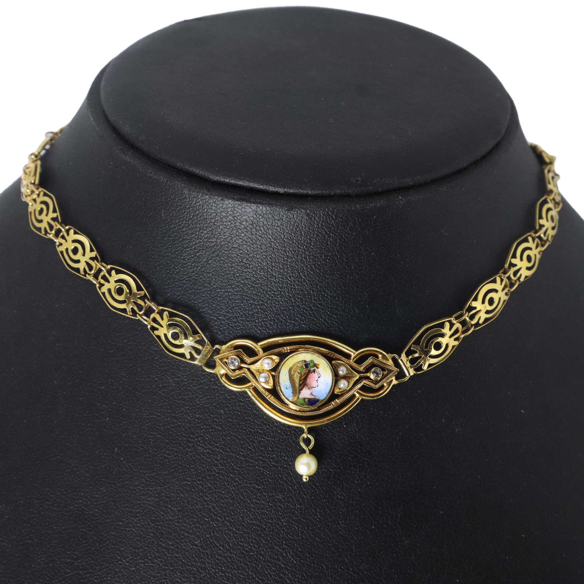 Girocollo in oro a basso titolo, centrale raffigurante Cleopatra con smalti e perline gr. 9,6