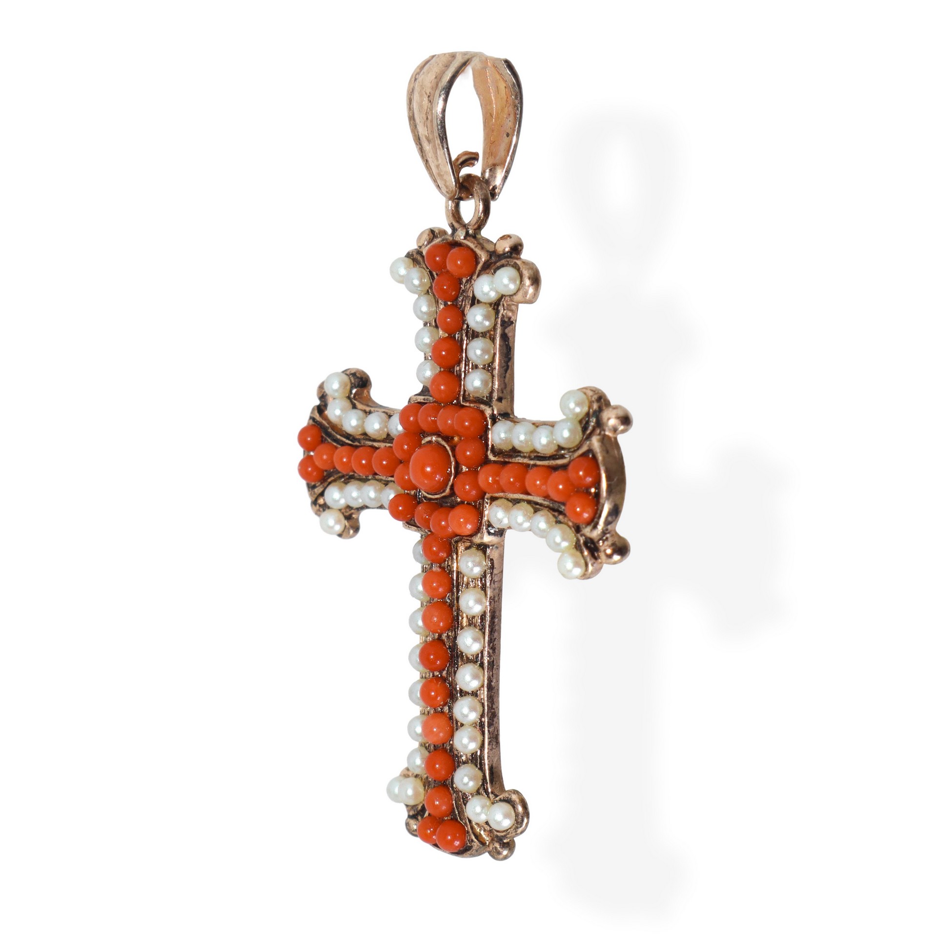 Croce in argento 925 con coralli e perline. Gr 9.8 c/ca cm 5x3,5