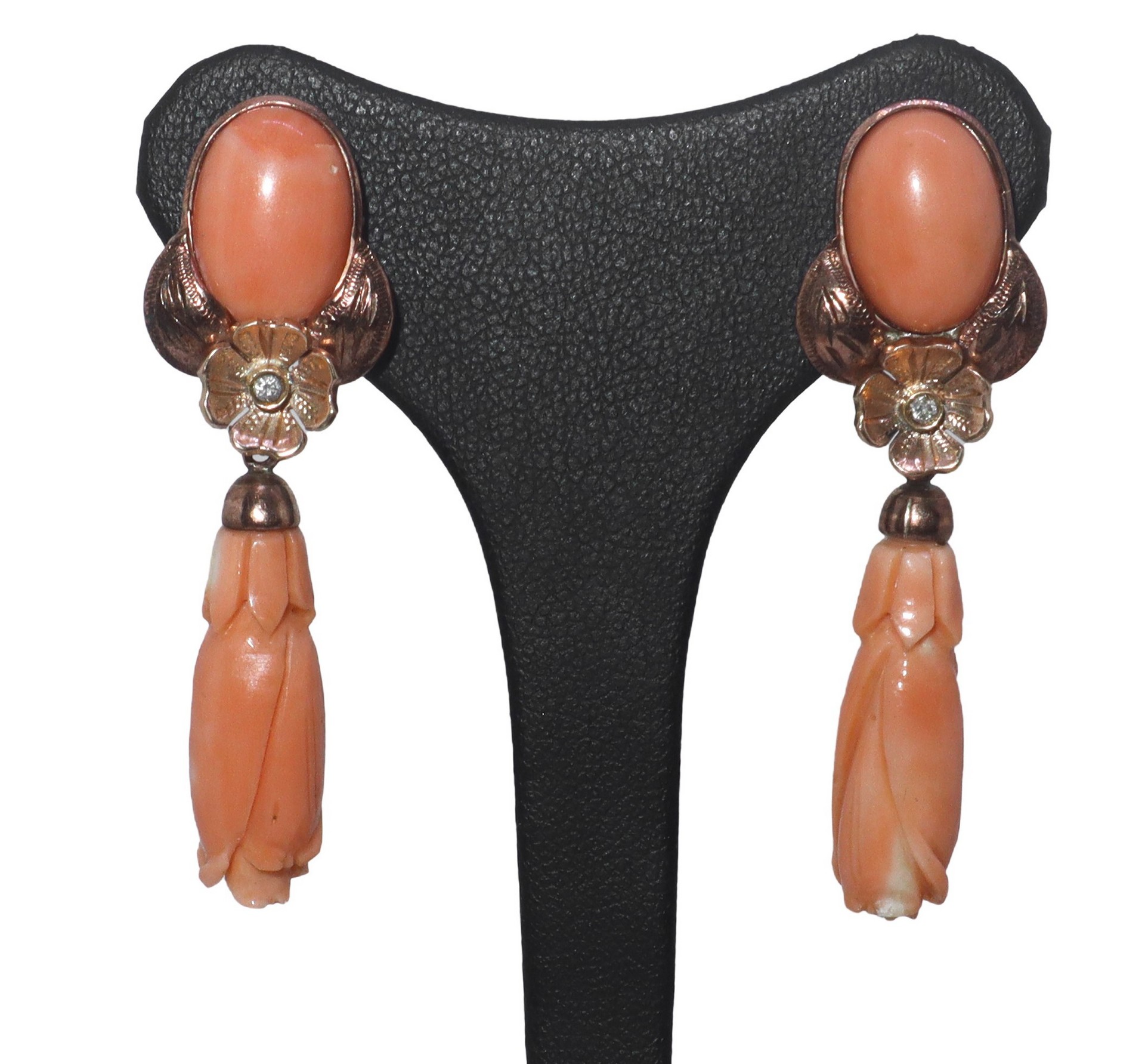 Orecchini a clip pendenti in oro a basso titolo e corallo rosa a fiore gr 7,5 cm 2