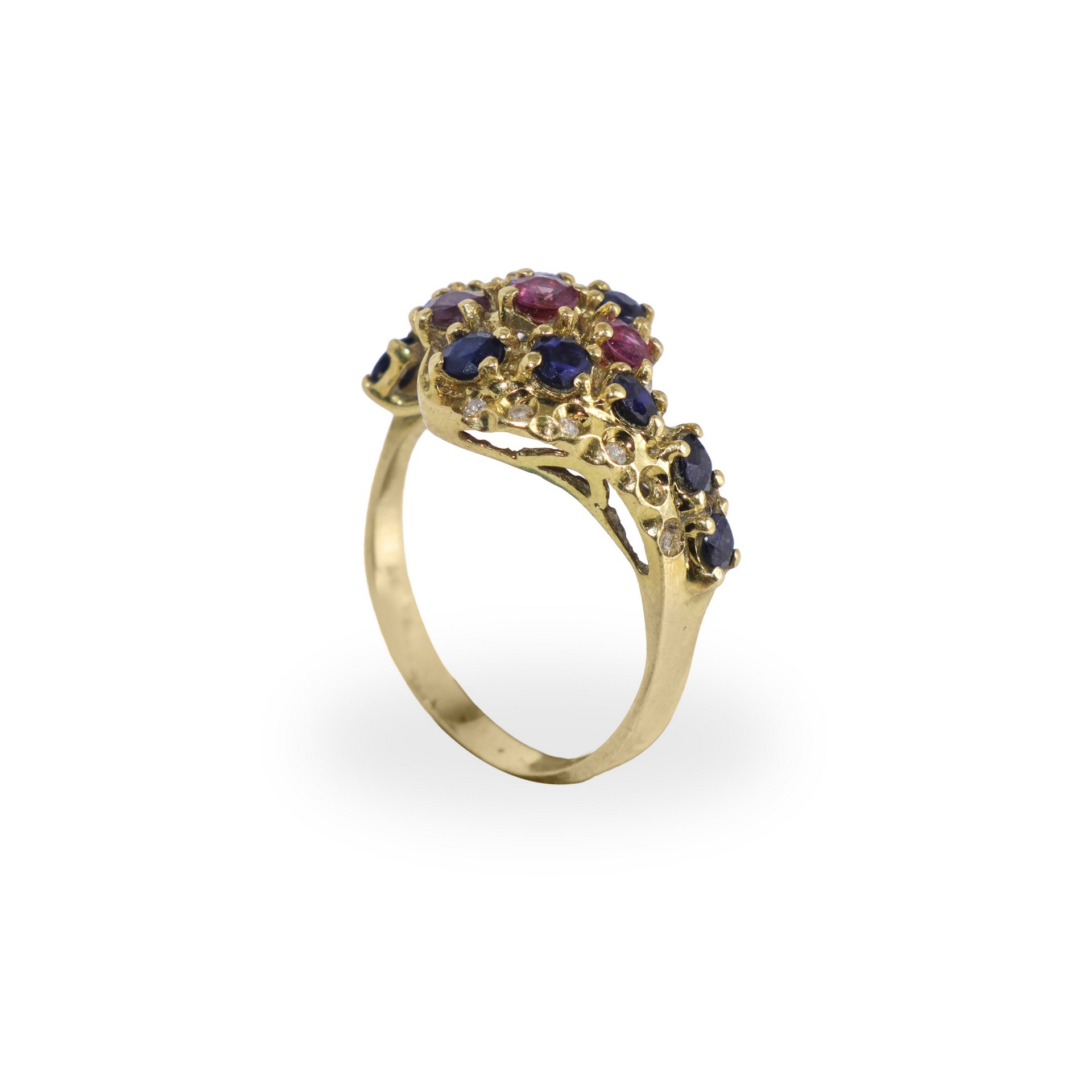 Anello in oro giallo 750 con zaffiri, tormaline rosa e diamanti