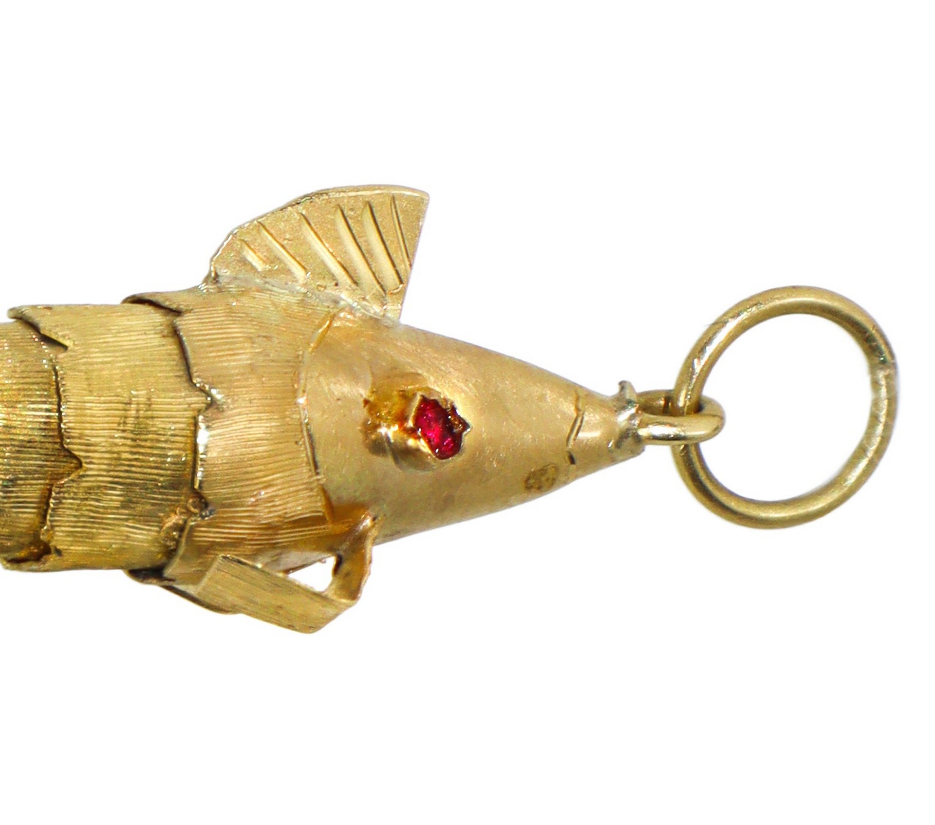 Pendentif a forma di pesce articolato in oro giallo 750 con occhio in rubino