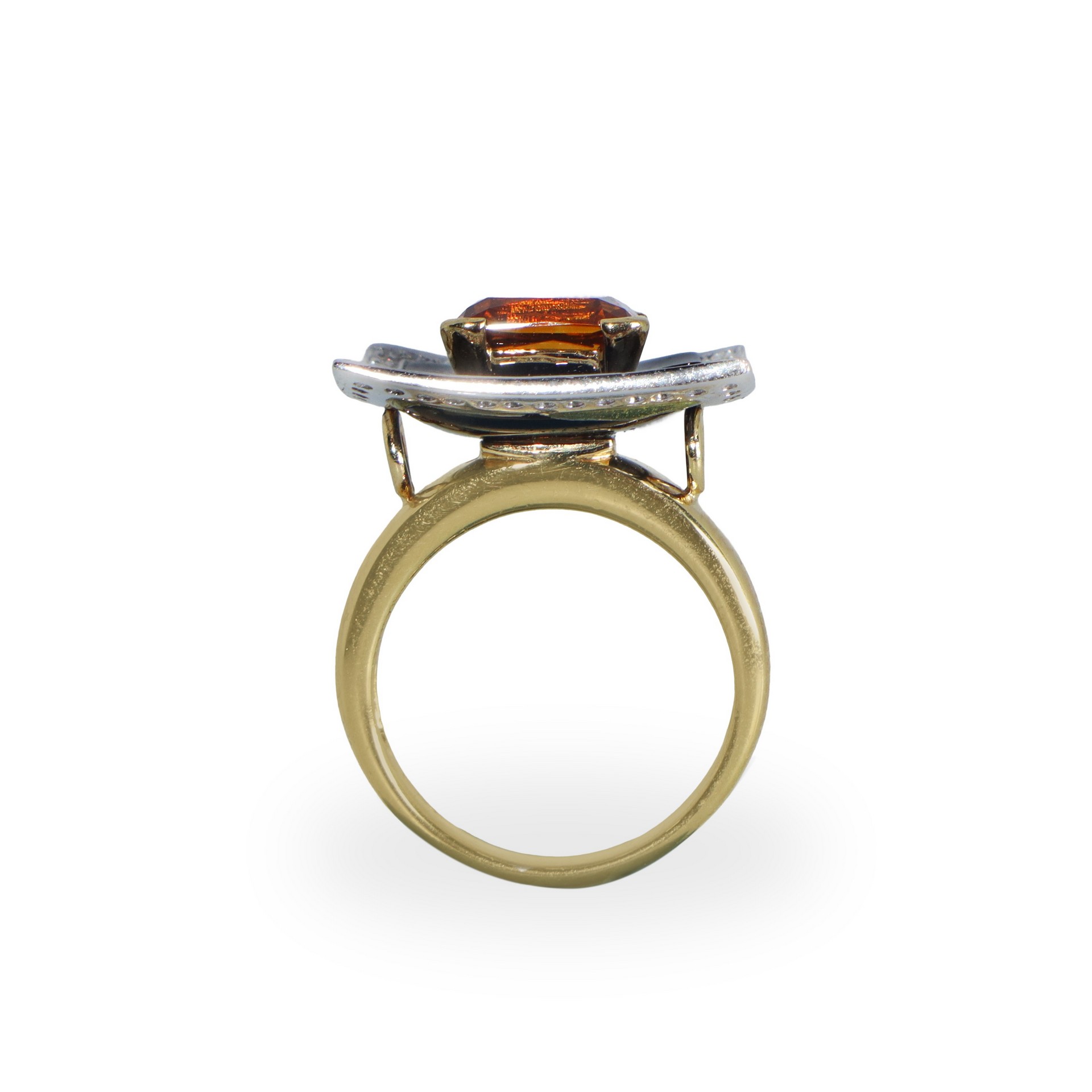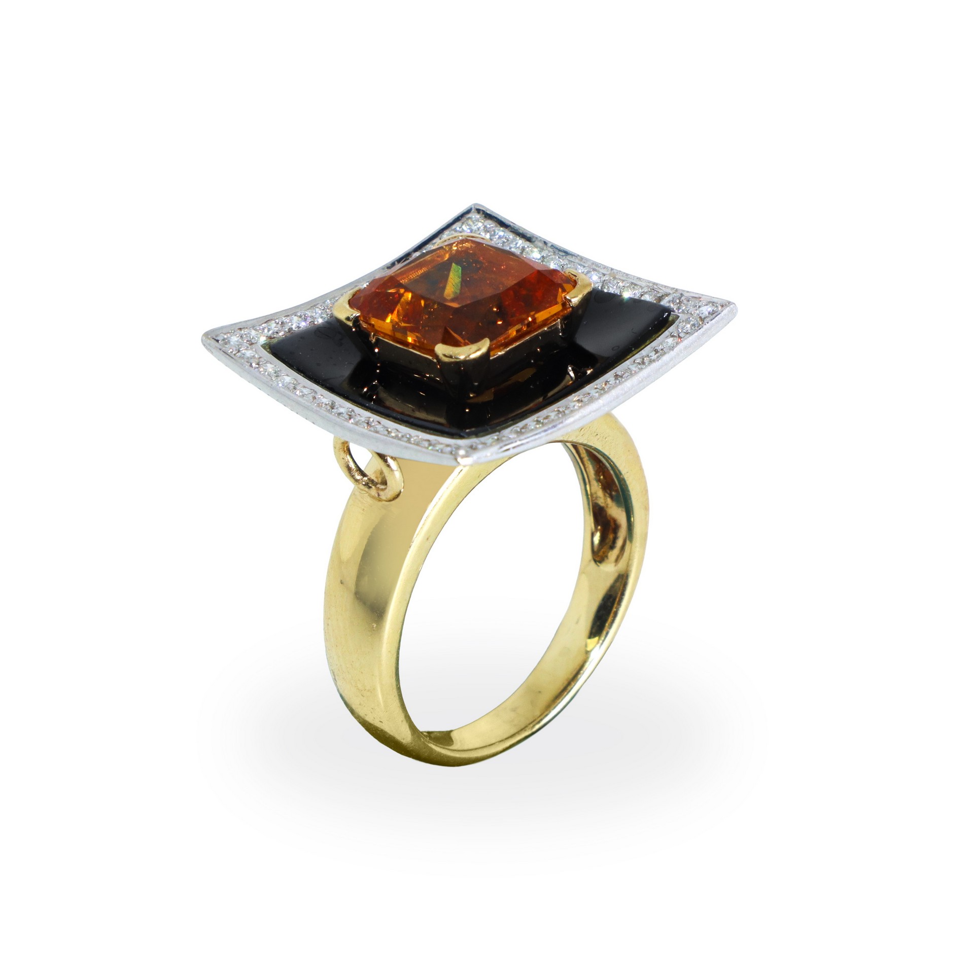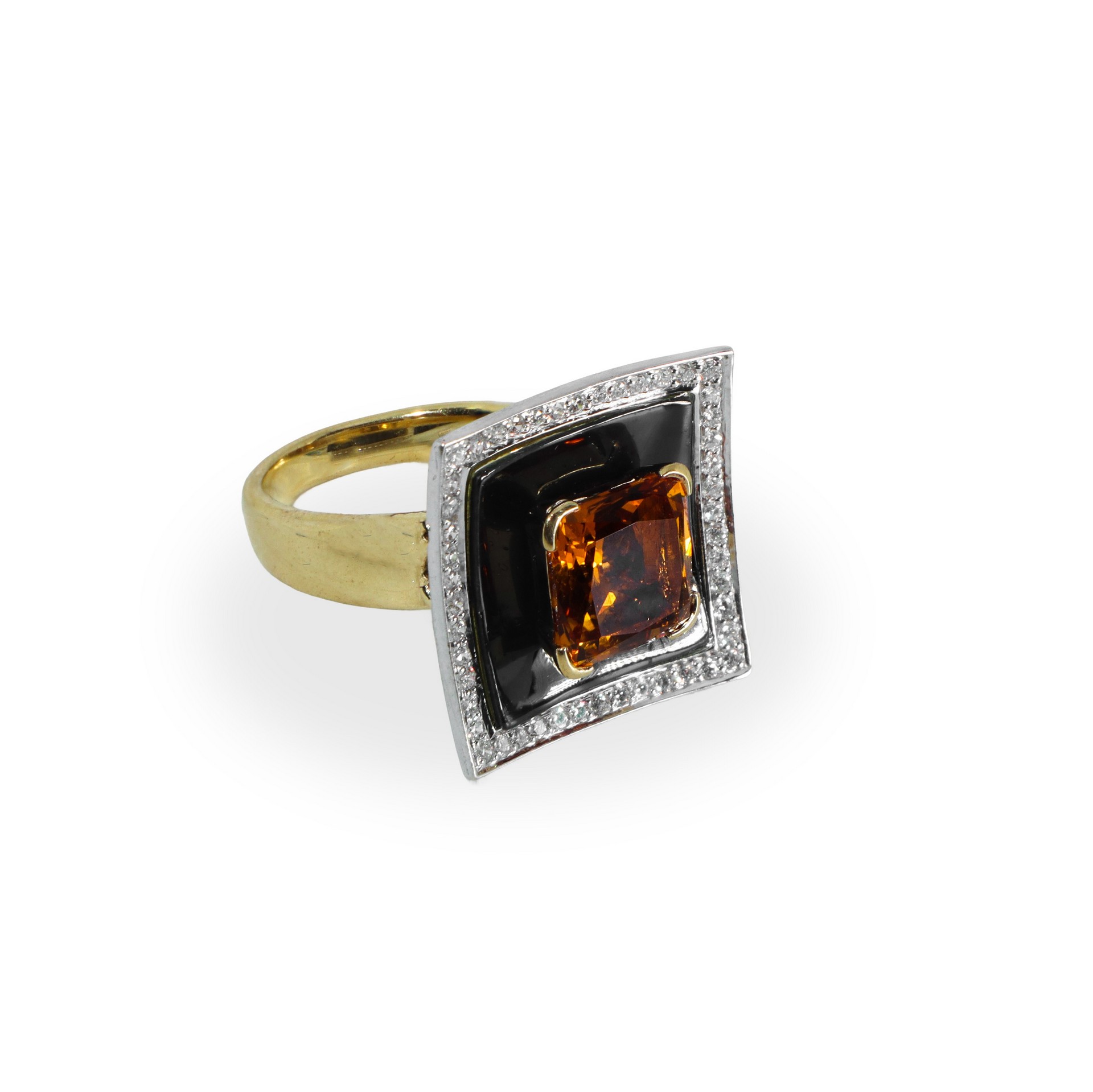 Anello in oro giallo e bianco 18 kt , con topazio citrino centrale su onice con ghiera di brillanti