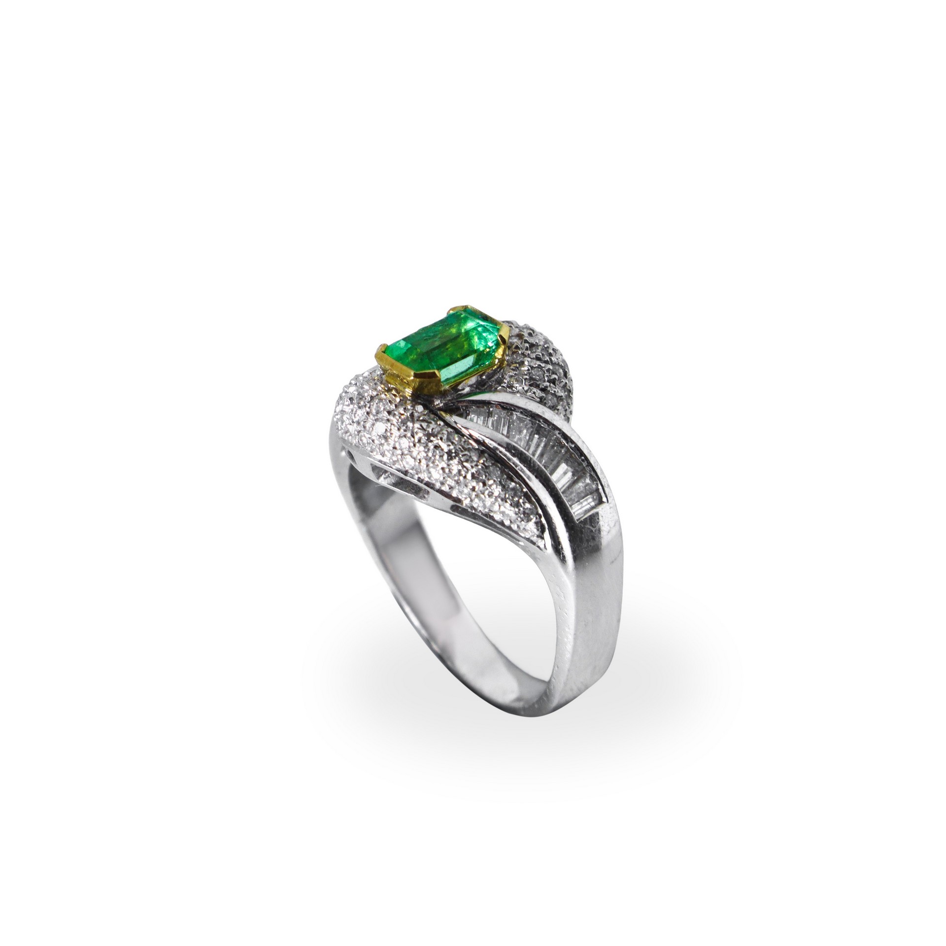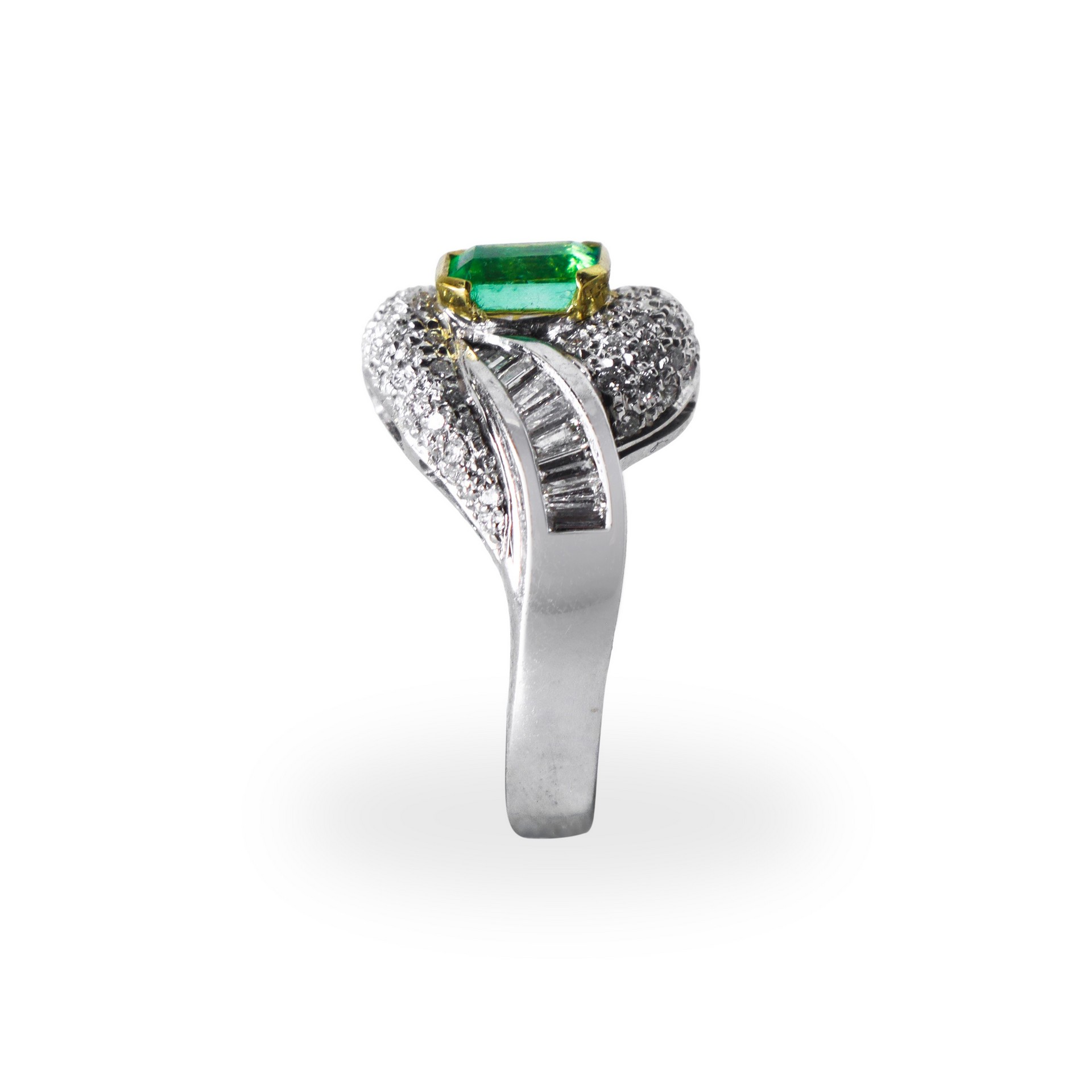 Anello in oro bianco con diamanti taglio brillante e baguette e smeraldo colombiano