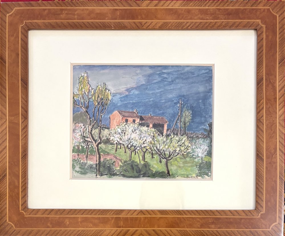Cino Bozzetti Lecce 1876 - Borgoratto alessandrino 1949 Cascinale nel Monferrato Acquerello su carta cm 15x18 firmato in basso a dx