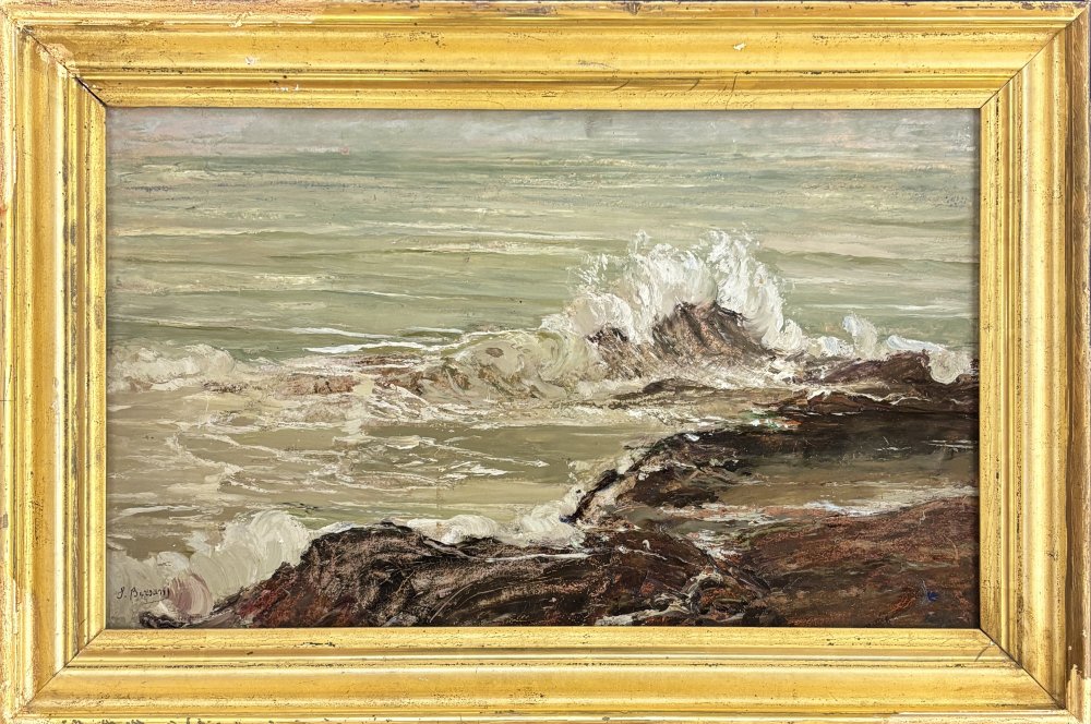 Stefano Bersani Melegnano 1872 - Lora 1914 Scogli a sant’Ampelio, Bordighera Olio su cartone cm 40x64 firmato in basso a sx