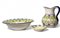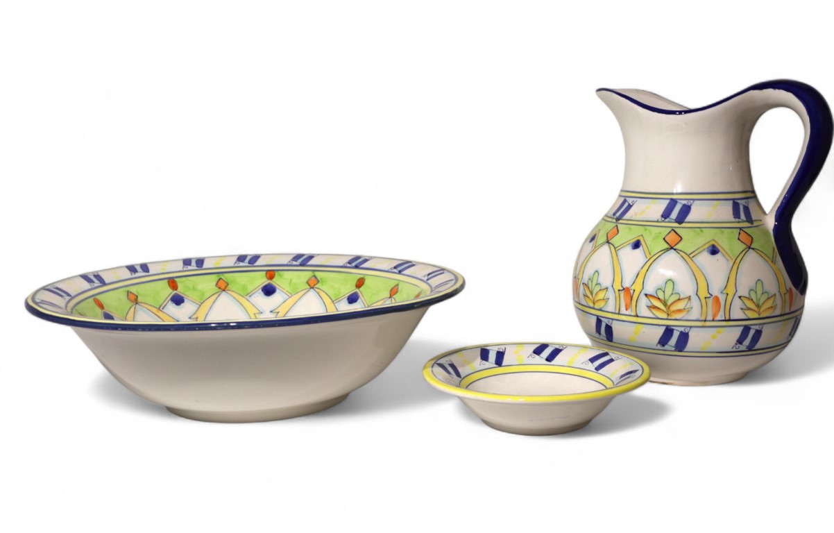 Brocca con catino e bacinella per il pennello da barba in maiolica policroma