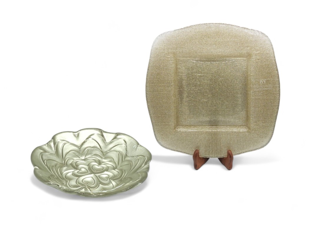 Coppa e grande piatto centrotavola in vetro pressato, IVV