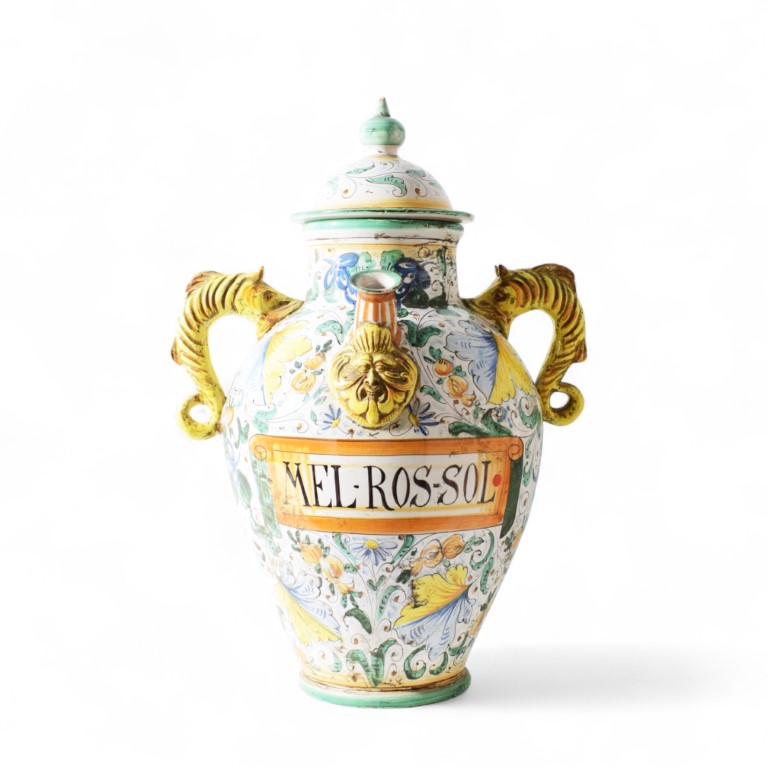 Anse modellate a cavalli marini, decorato a motivi fitomorfi ed iscritto MEL-ROS-SOL entro cartigli, completo di coperchio.