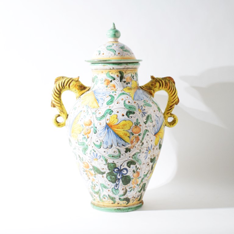 Grande vaso fa farmacia ad anfora in maiolica policroma in stile seicento