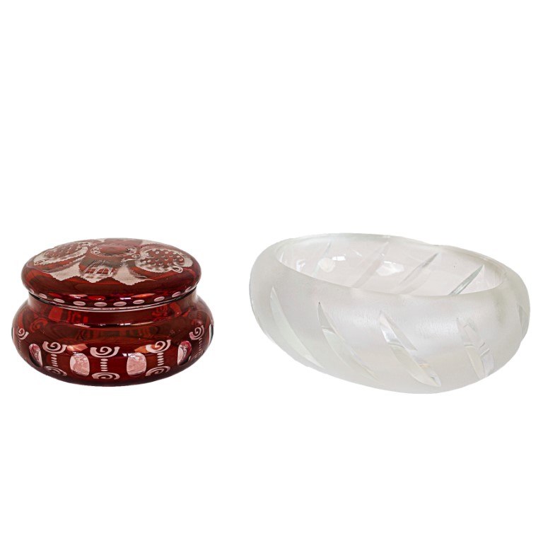 uno a scatola con coperchio in vetro rosso molato con vedute e motivi vegetali, l'altro ovale in vetro bianco sagomato decorato a strigliature.