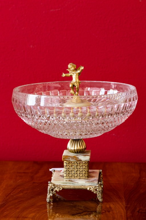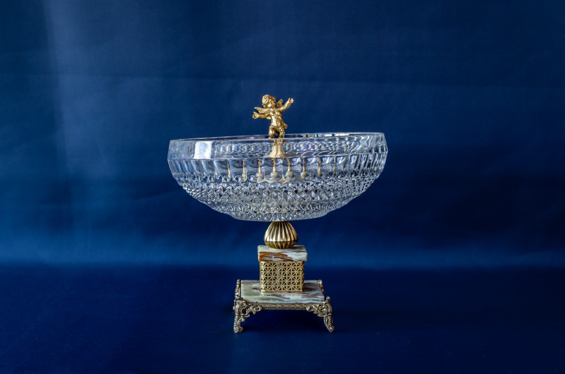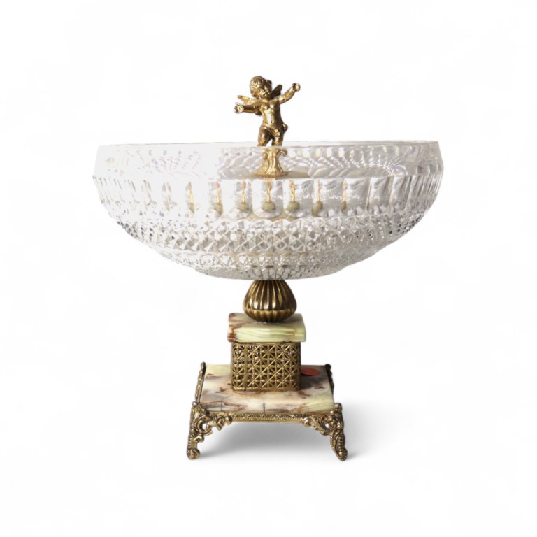 Alzata in cristallo molato e metallo dorato su base in onice Altezza cm 20