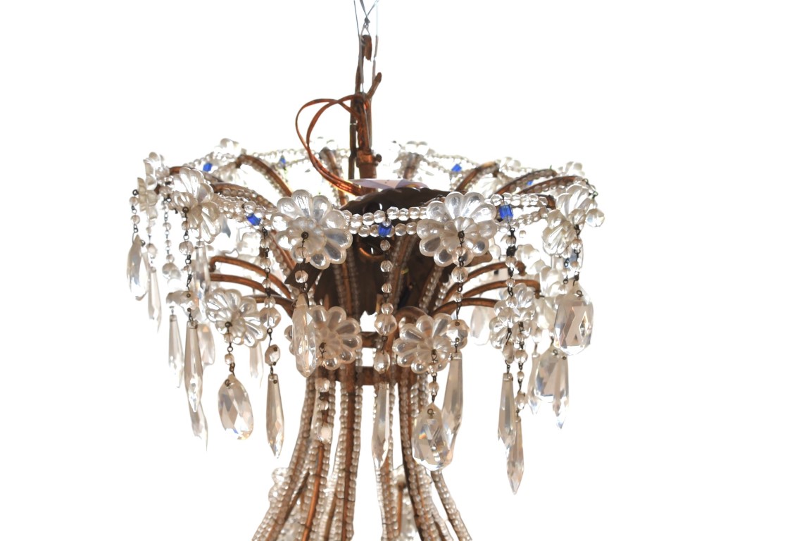 Grande lumiera in metallo dorato con collane pendenti sfaccettati e in vetro...