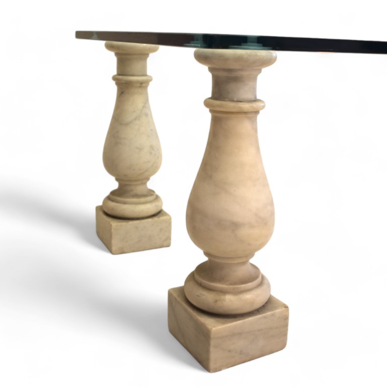 Con quattro sostegni a balaustro in marmo bianco e piano in cristallo danneggiato