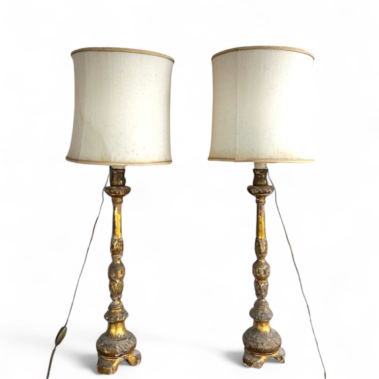 Lotto 282 | Coppia di candelieri in legno intagliato e dorato a mecca XIX secolo fusto a...