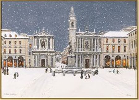 PIGINO CARLO Palazzolo Vercellese 1943 Piazza San Carlo e la neve Olio ed acrilici su tela cartonata 50x70 cm Firma in basso a sinistra e localizzazione in basso a destra Etichetta dell'atelier dell'artista al retro Oil and acrylic on canvas cardboard Signed lower left and lower right location