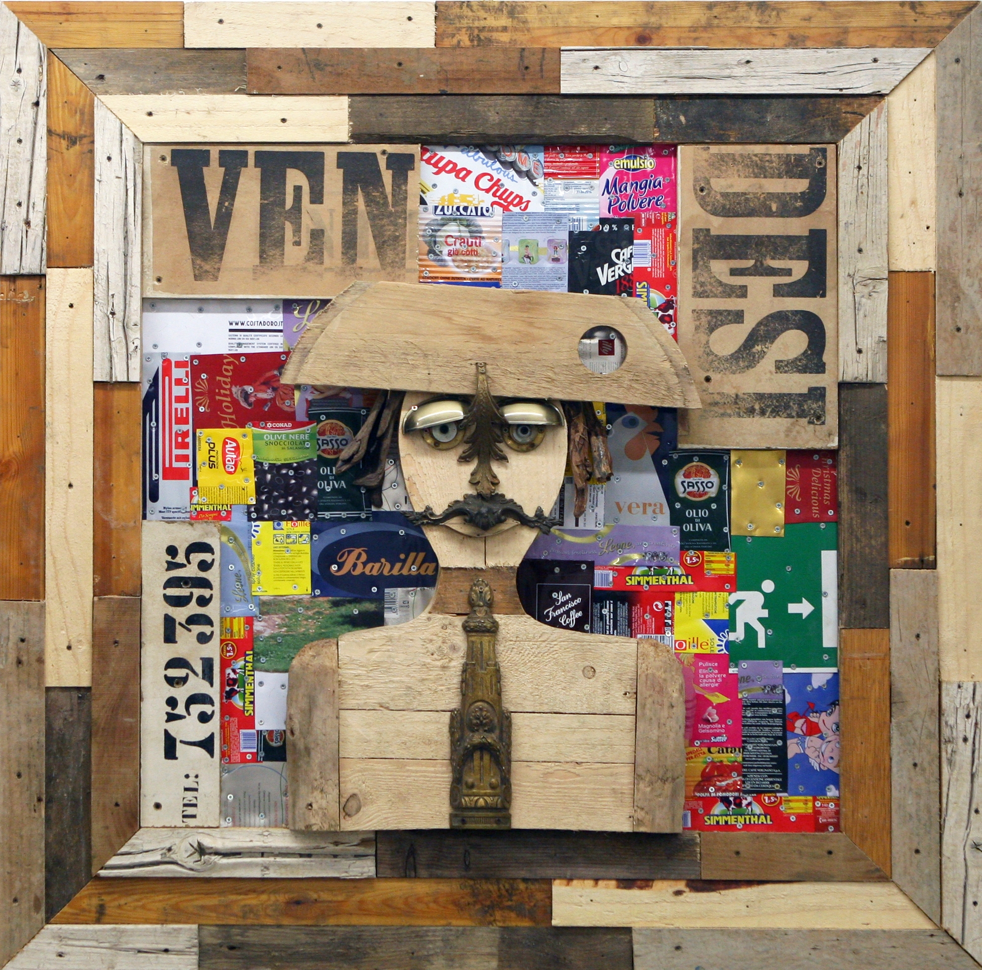 Lele De Bonis torino 1980 Capitan Fracassa caduto in miseria Tecnica mista e collage su tavola 100x100x6