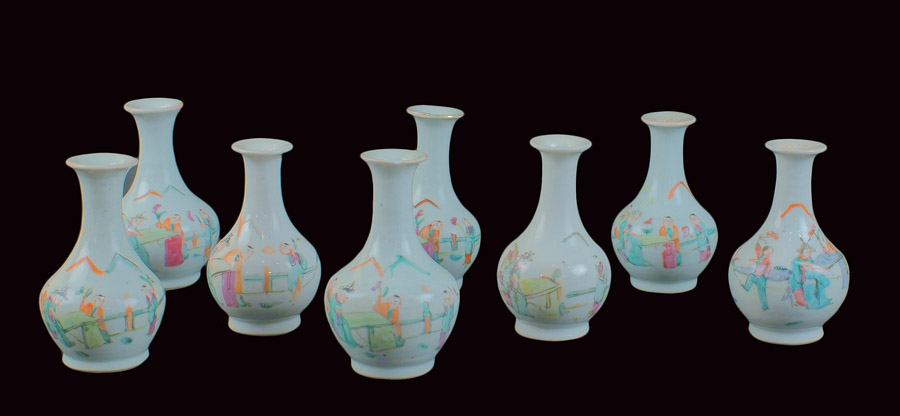 OTTO PICCOLI VASI IN PORCELLANA Cina, XX Sec. dipinti in policromia (uno con difetti) h. 13 cm.