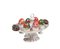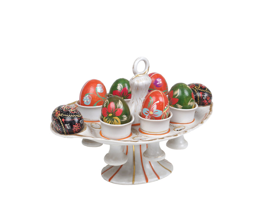 PORTAUOVA IN PORCELLANA XIX Sec. dipinto in policromia e parzialmente dorato completo di otto uova decorative (lievi difetti) 17x28x20 cm.