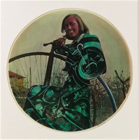 BERTINI GIANNI Pisa 1922-2010 Cahen Il velocipede 1979 Tecnica mista su tela 80x80 cm Firma e data in basso a destra. Firma, titolo e data al retro Autentica dell'artista su fotografia Mixed media on canvas Signed and dated lower right.
