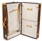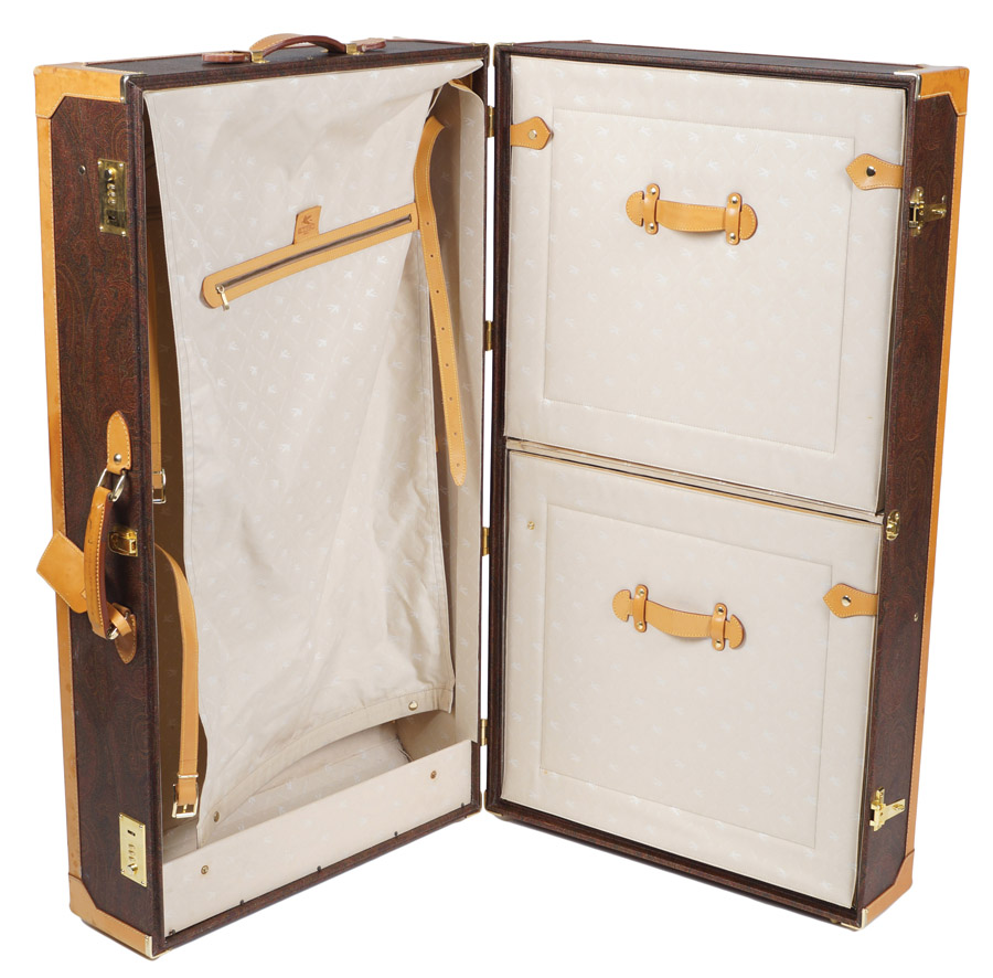 GRANDE VALIGIA RIGIDA ETRO rivestita in tessuto plastificato a disegni cachemire in colori vari su fondo marrone, profili in cuoio chiaro, manico stondato con portanome, para angoli e cerniere in metallo dorato, interno rivestito in tessuto color ecru logato, provvista di rotelle, difetti 94x52x29 cm.