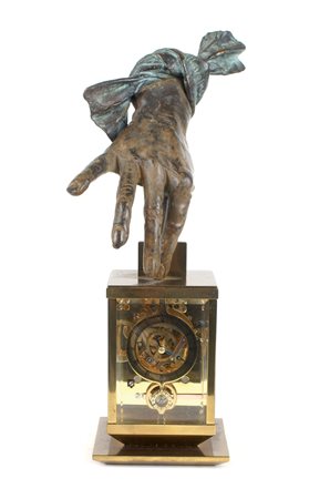 COSTANTINO MONGINI Milano 1918 - 1981 "Mano con orologio", scultura multiplo in bronzo patinato es. 2/100, orologio scheletrato Matthew Norman Londra, quadrante e ghiera in ottone con indici numeri romani 35x11x10 cm.