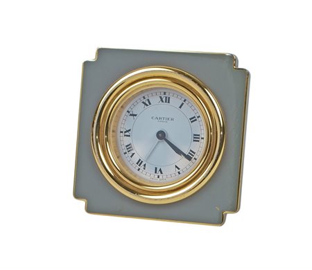 CARTIER, OROLOGIO SVEGLIA DA TAVOLO Francia, XX Sec. in ottone dorato e smalto, movimento meccanico a carica manuale, cassa, quadrante e movimento firmati, funzionante (smalto lievi difetti) 7,5x7,5 cm.
