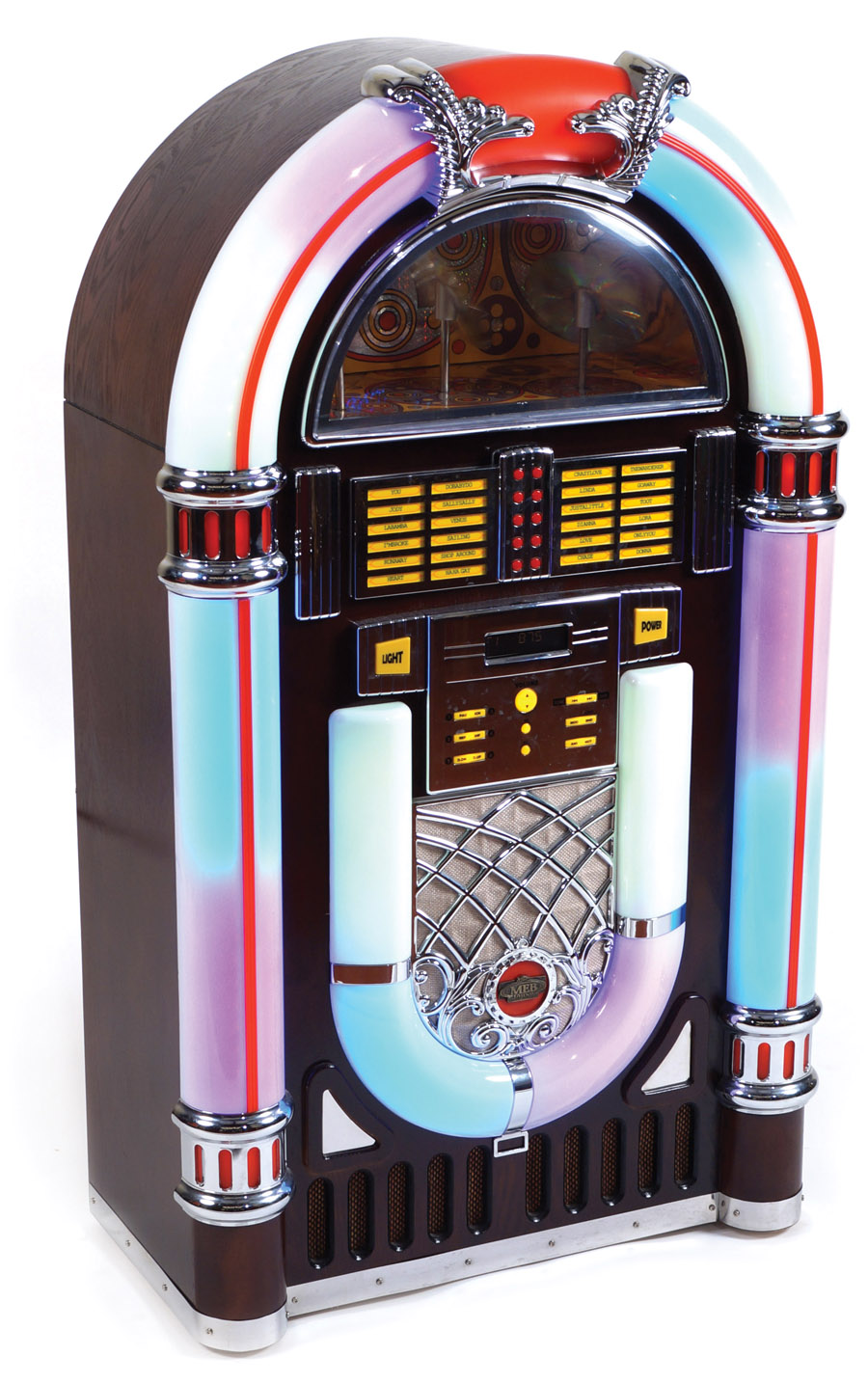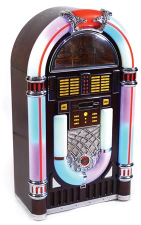 JUKE-BOX RADIO E LETTORE CD produzione recente cornice retro illuminata in vari colori, caricatore da 10 cd, perfettamente funzionante 112x53x33 cm.