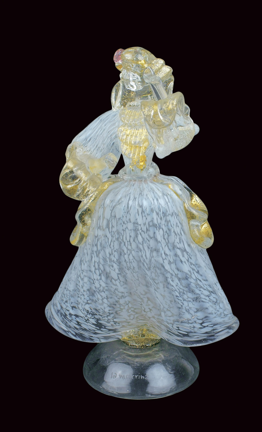 FIGURA DI DAMA LA MURRINA Murano, XX Sec. in vetro soffiato color cristallo con dettagli screziati in oro e bianco, poggiante su base circolare, firmata sulla base h. 21,5 cm.