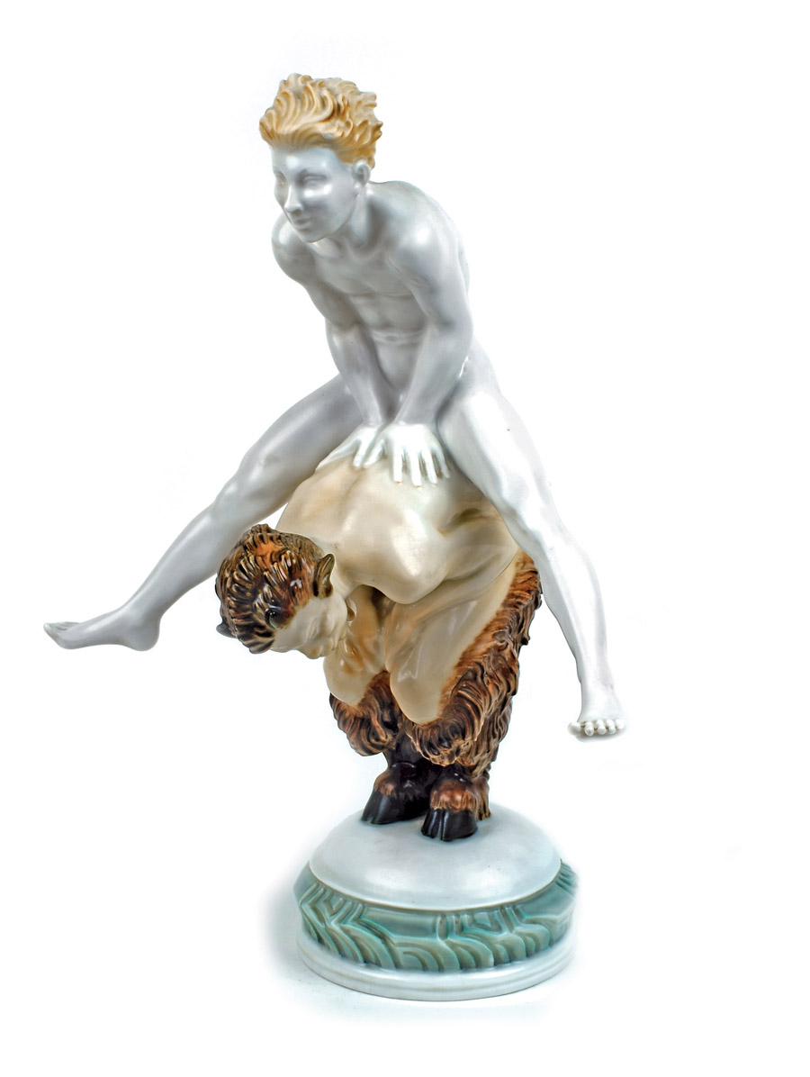 GRUPPO IN PORCELLANA POLICROMA SELB Germania, metà XX Sec. raffigurante un giovane con satiro, poggiante su base circolare, marchio sotto la base h. 36 cm.