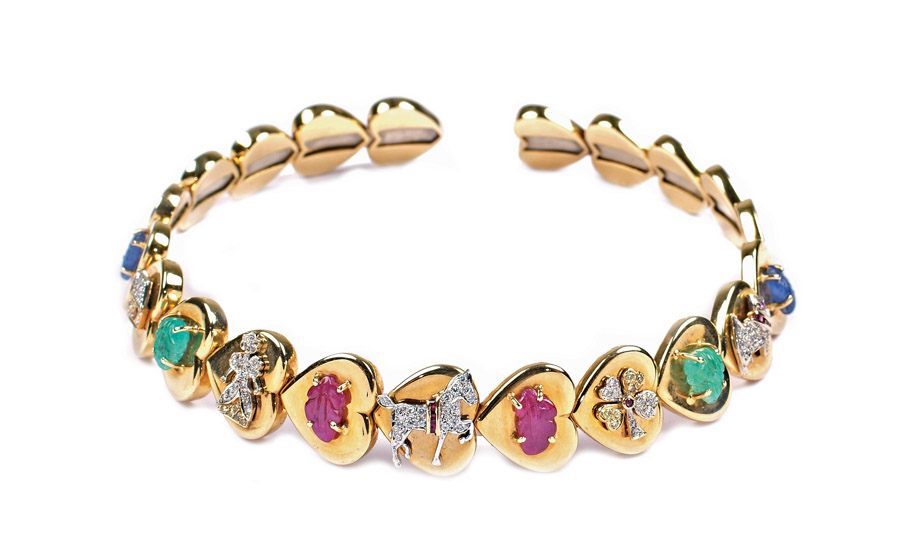 COLLIER DE CHIEN A MOTIVO DI CUORI IN ORO GIALLO 18KT con cinque charms applicati in oro, diamanti taglio brillante per 0,40 punti circa, zaffiri gialli e rubini alternati a zaffiri, smeraldi e rubini incisi a motivo di foglia, diametro cm. 11,5 peso 112 gr.
